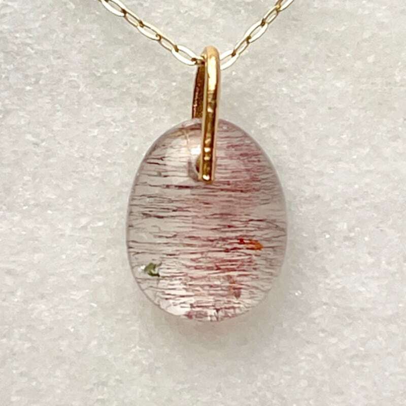 光に透かしてみると赤と紫が美しいスーパーセブンです。光に透かしてみると赤と紫が美しいスーパーセブンです。レピドクロサイトと呼ばれる内包物がぎっしり入っていて、光にあてると金属的な光がキラキラと輝きます。