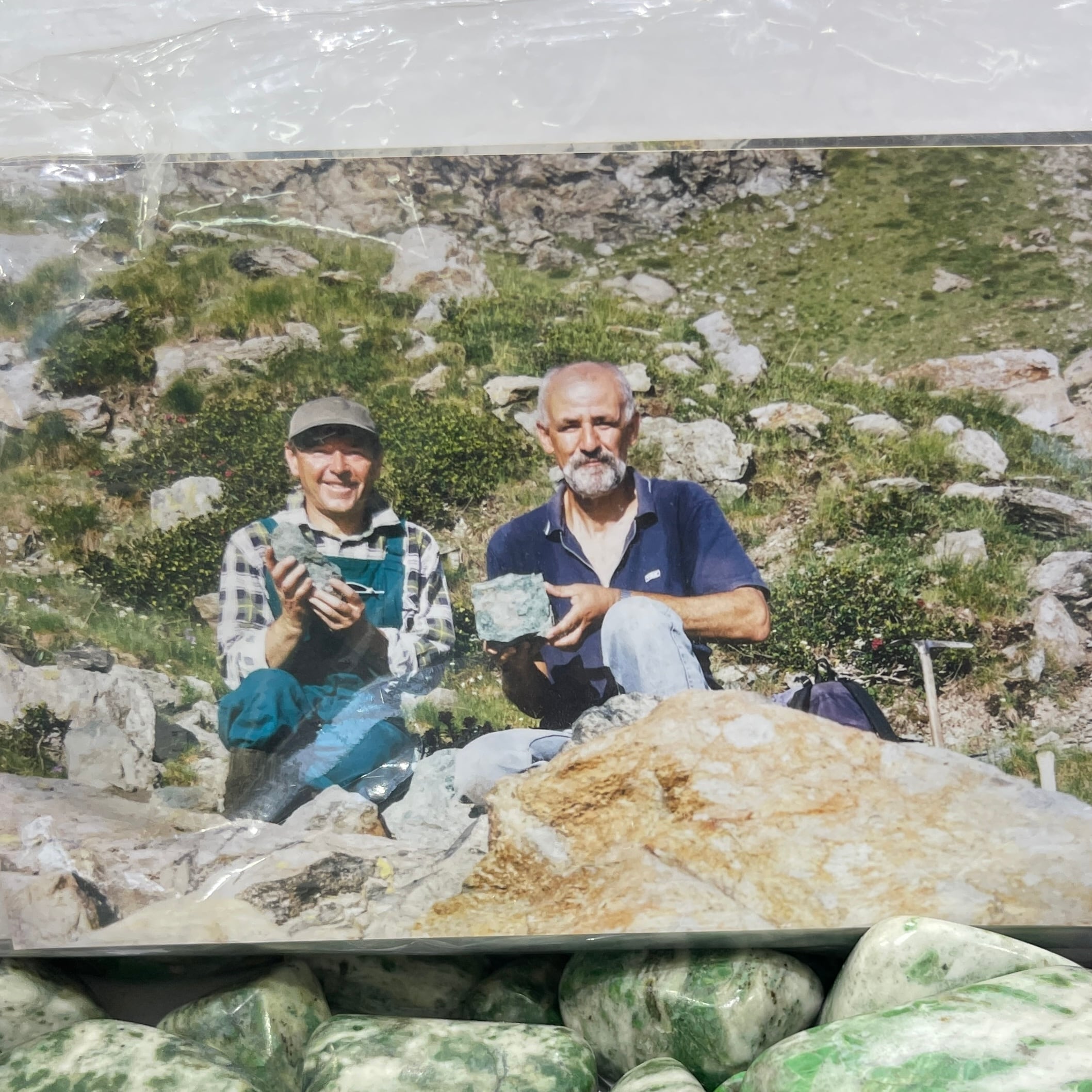 鉱山主からもらったタグにはイタリア・アルプスのモンヴィーゾ山系で産出される、希少なローカルストーン「ジャーダ・アルレッキーノ」と表記されています。翡翠を意味する「ジャーダ(Giada)」に、カラフルな斑模様がイタリアの伝統道化師「アルレッキーノ(Arlecchino)」の衣装を思わせることから名付けられました。