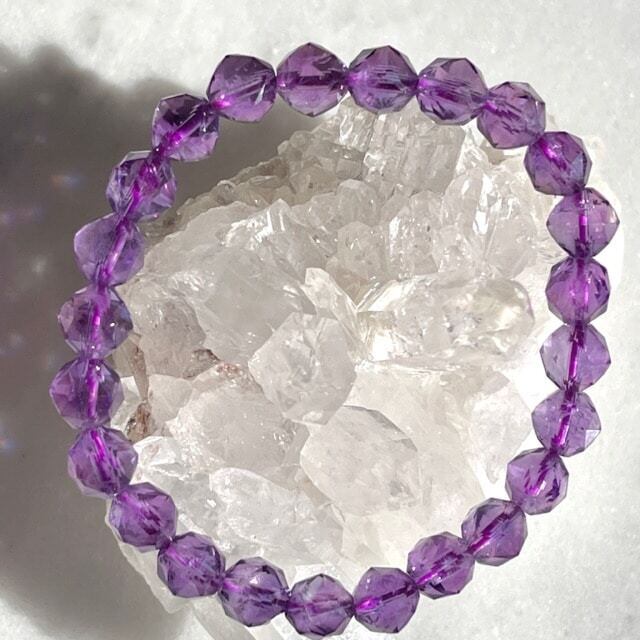 キラキラと輝く8㎜アメジストのブレスレット。美しいスターカットはさりげなく女性らしい上品さを演出してくれます。