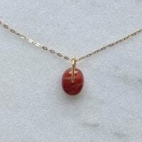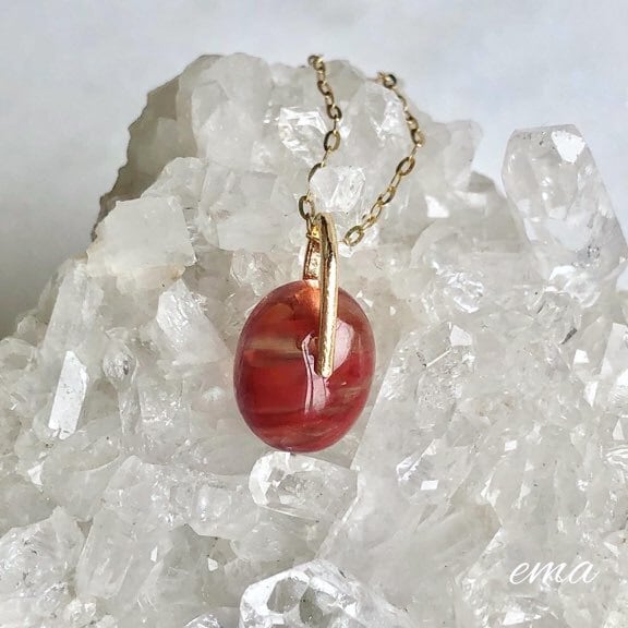 こちらのペンダントは自然光の下ではえんじ色に近いこっくりとした赤い色に見えますが、光に透かしてみるとグリーンの光が現れます。