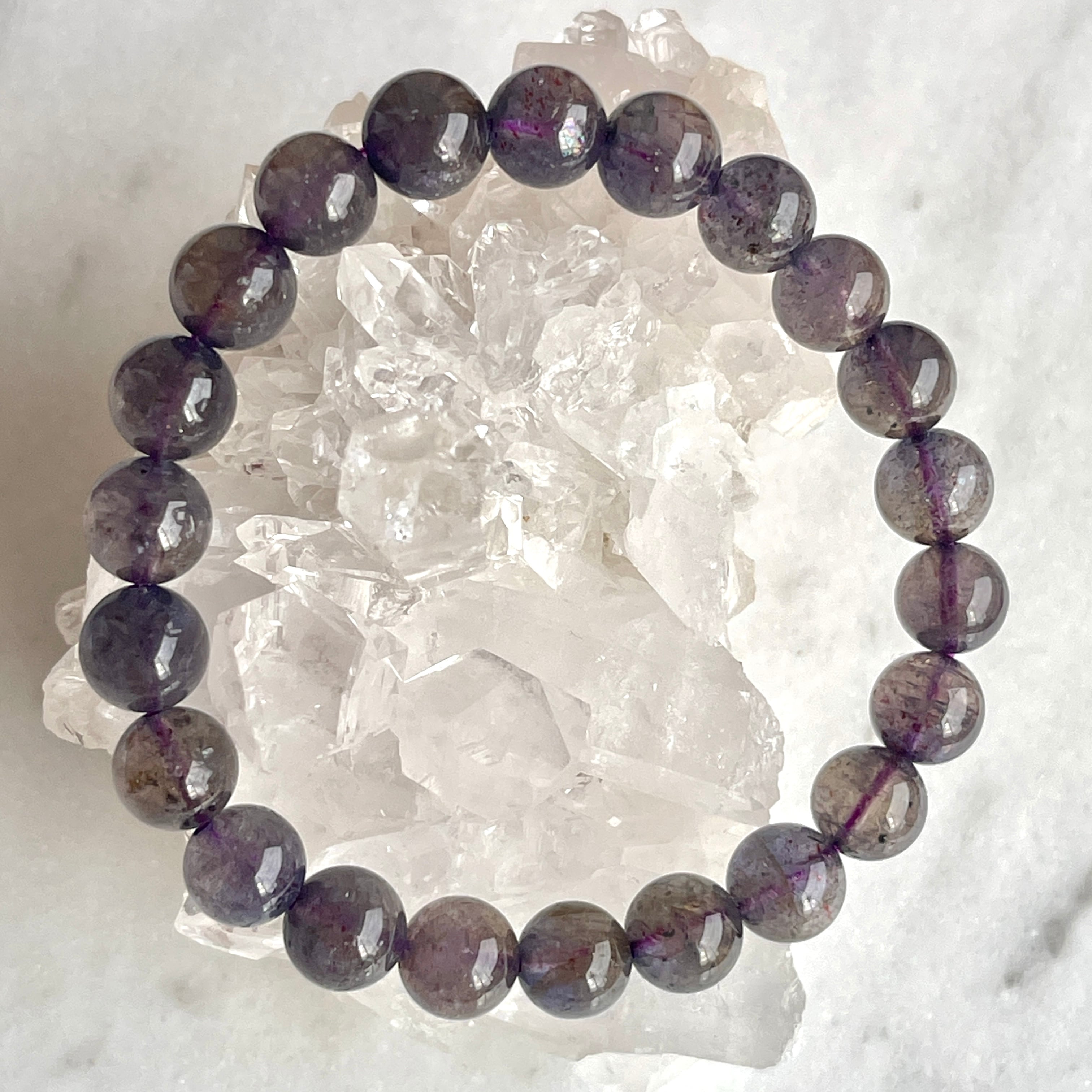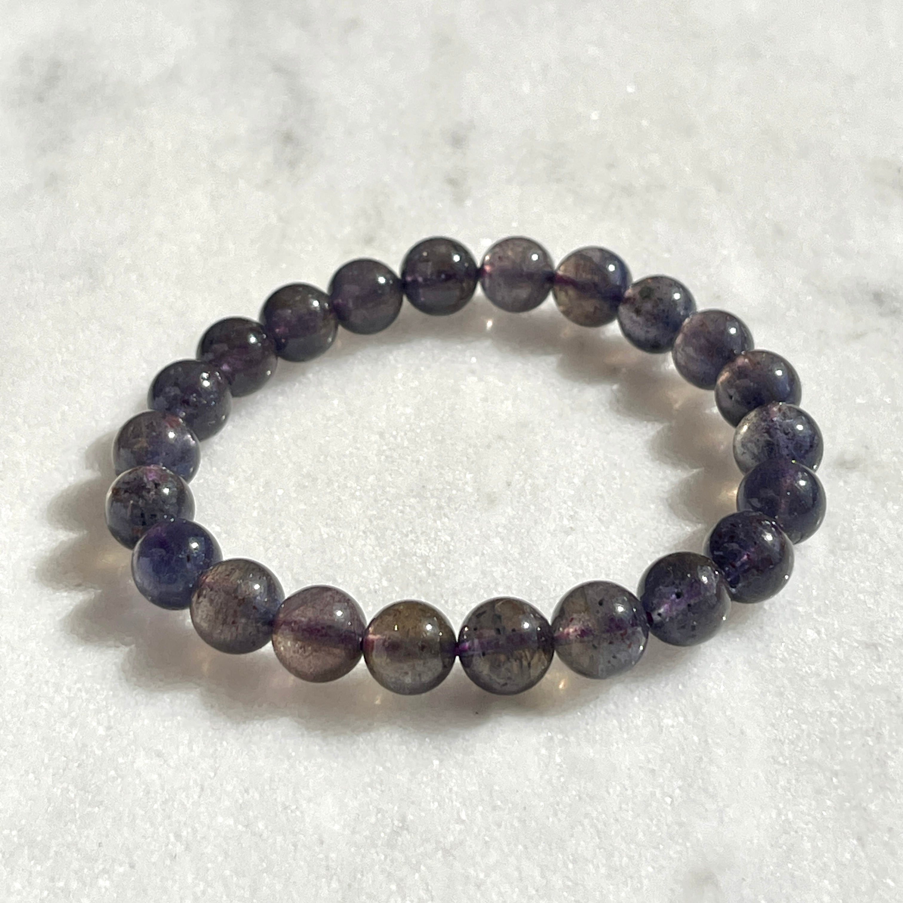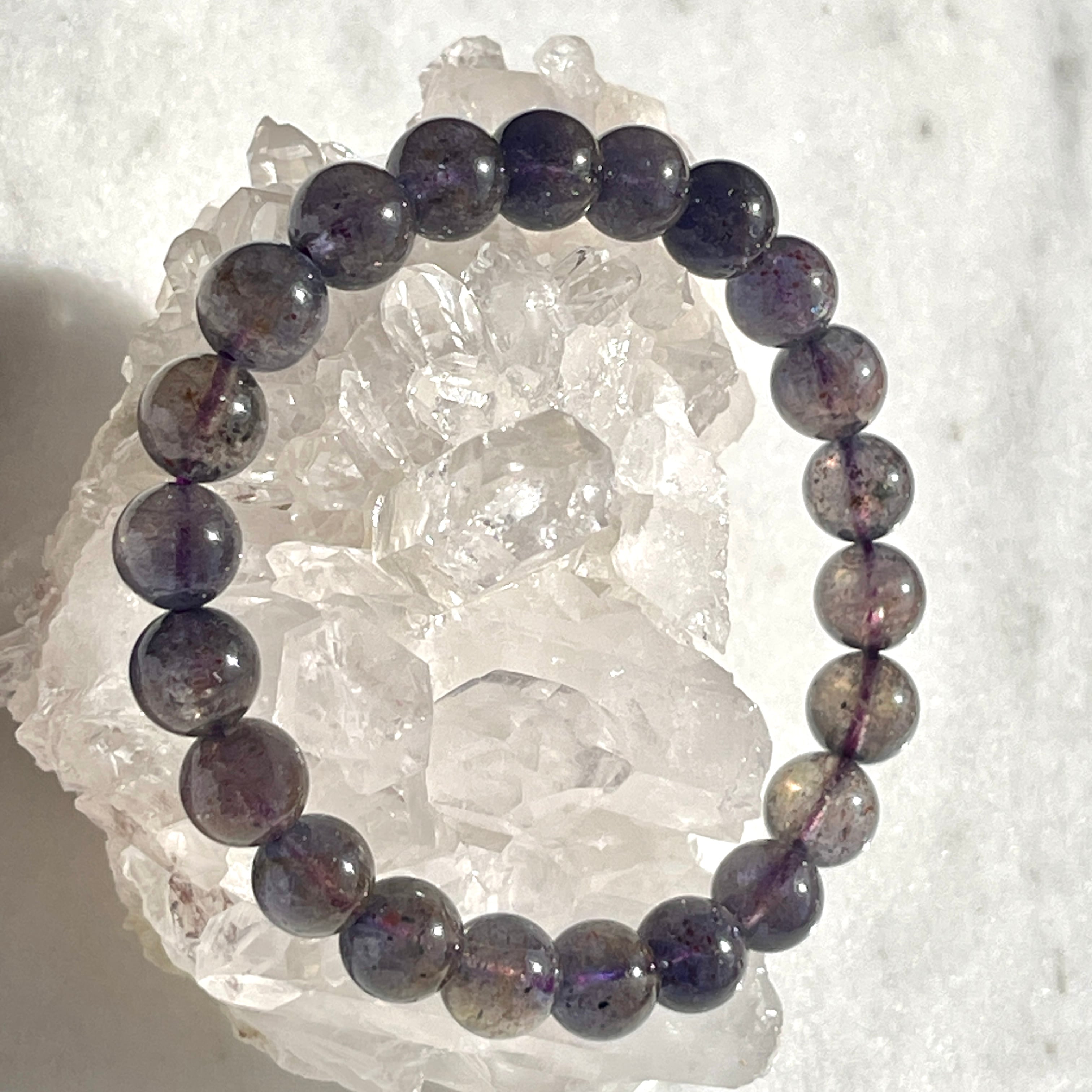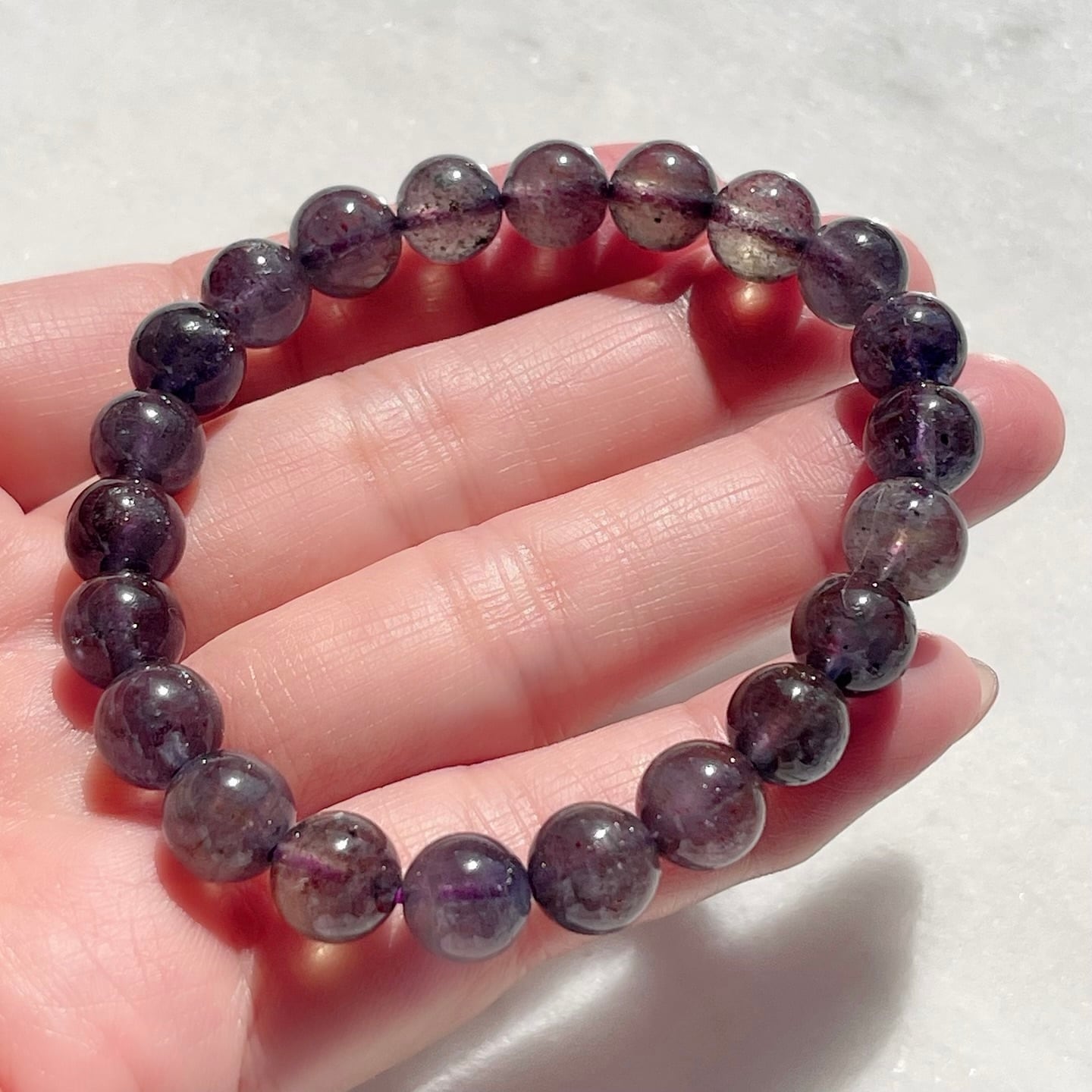 こちらはタンザニア産のブラッドショットアイオライトサンストーンのブレスレットです。