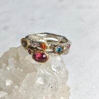 この宝石箱をひっくり返したように散りばめられた感じのデザインが素敵で一目ぼれして買い付けたリング。