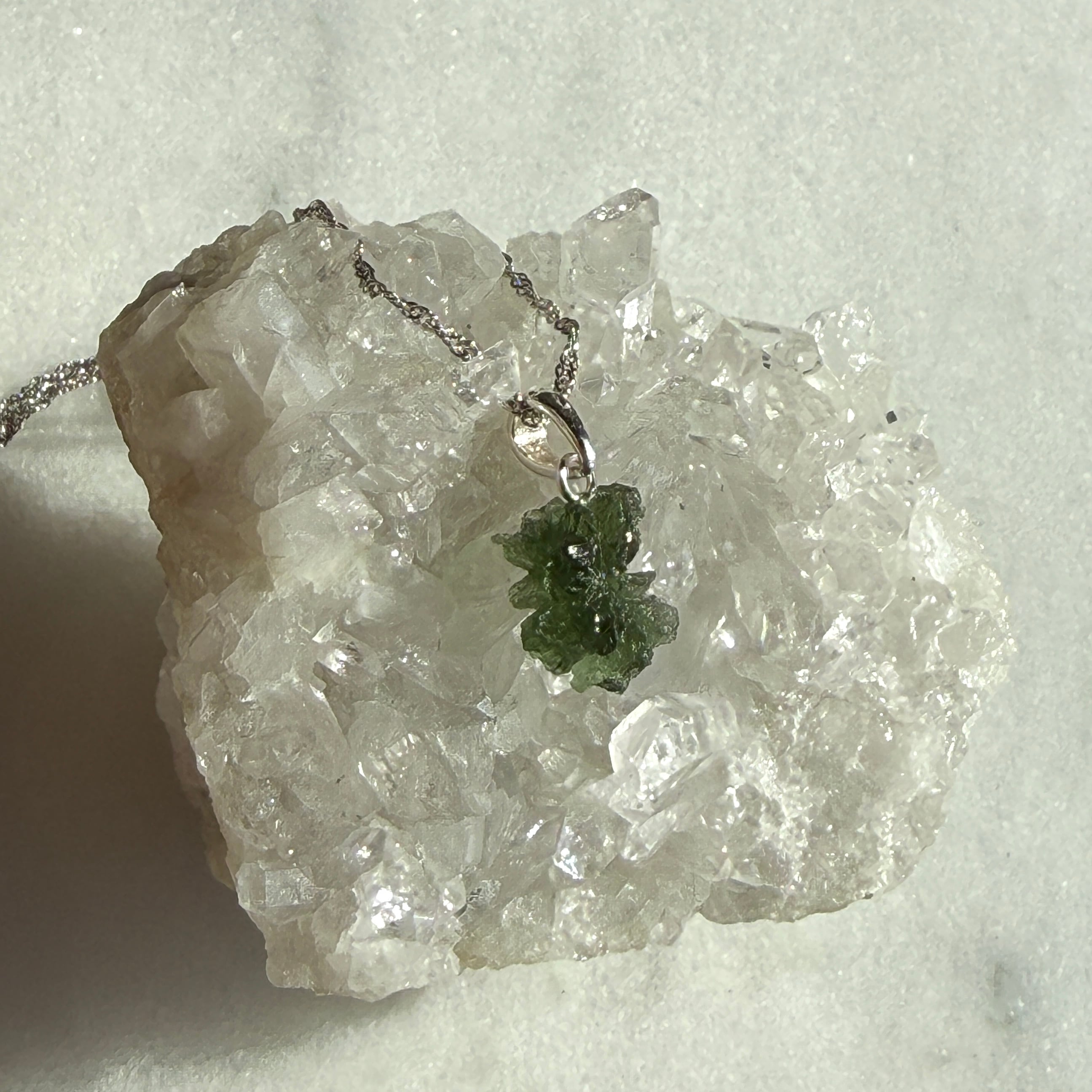 モルダバイトは、約1,500万年前に隕石が地球に衝突した際の衝撃で生まれた、奇跡のガラス質天然石。