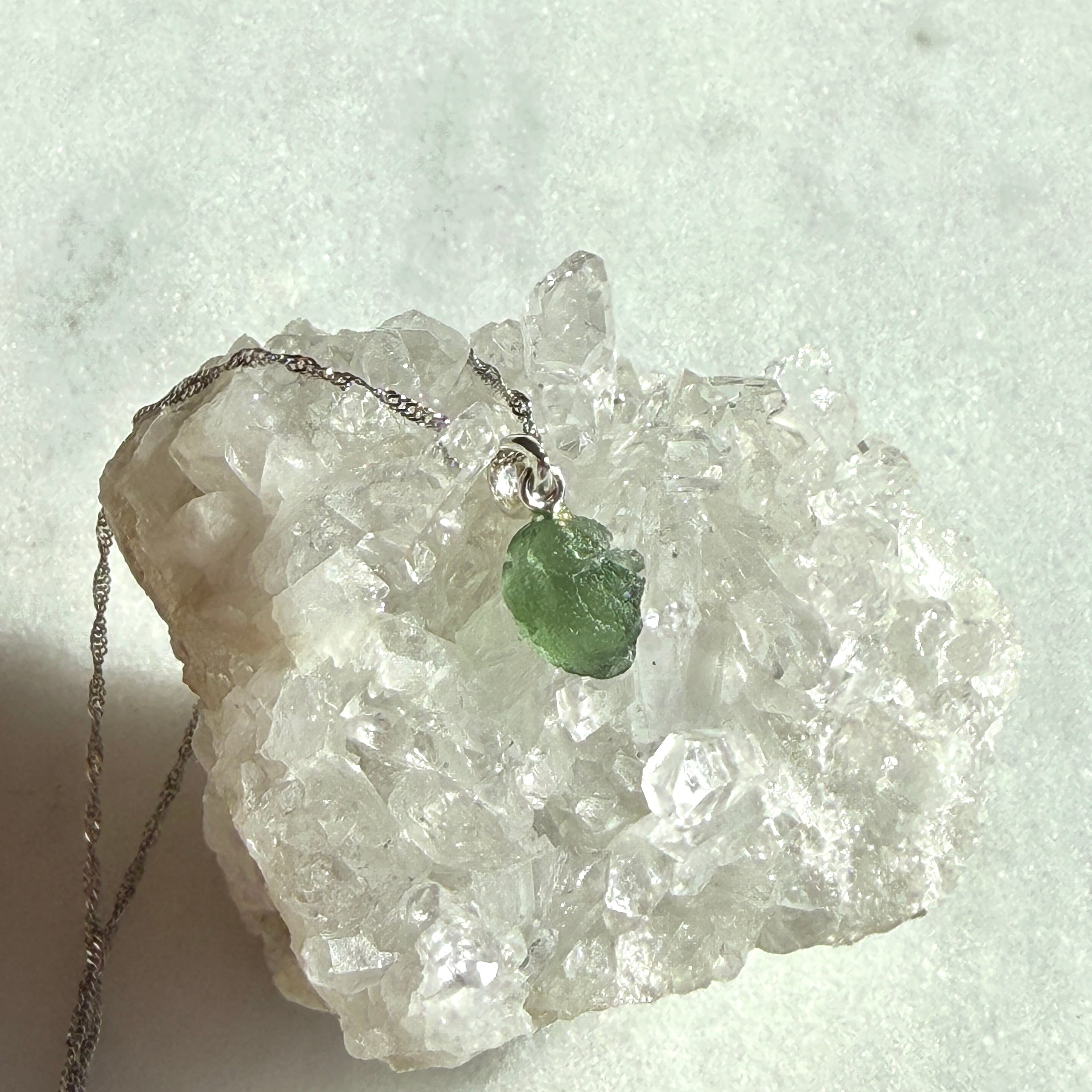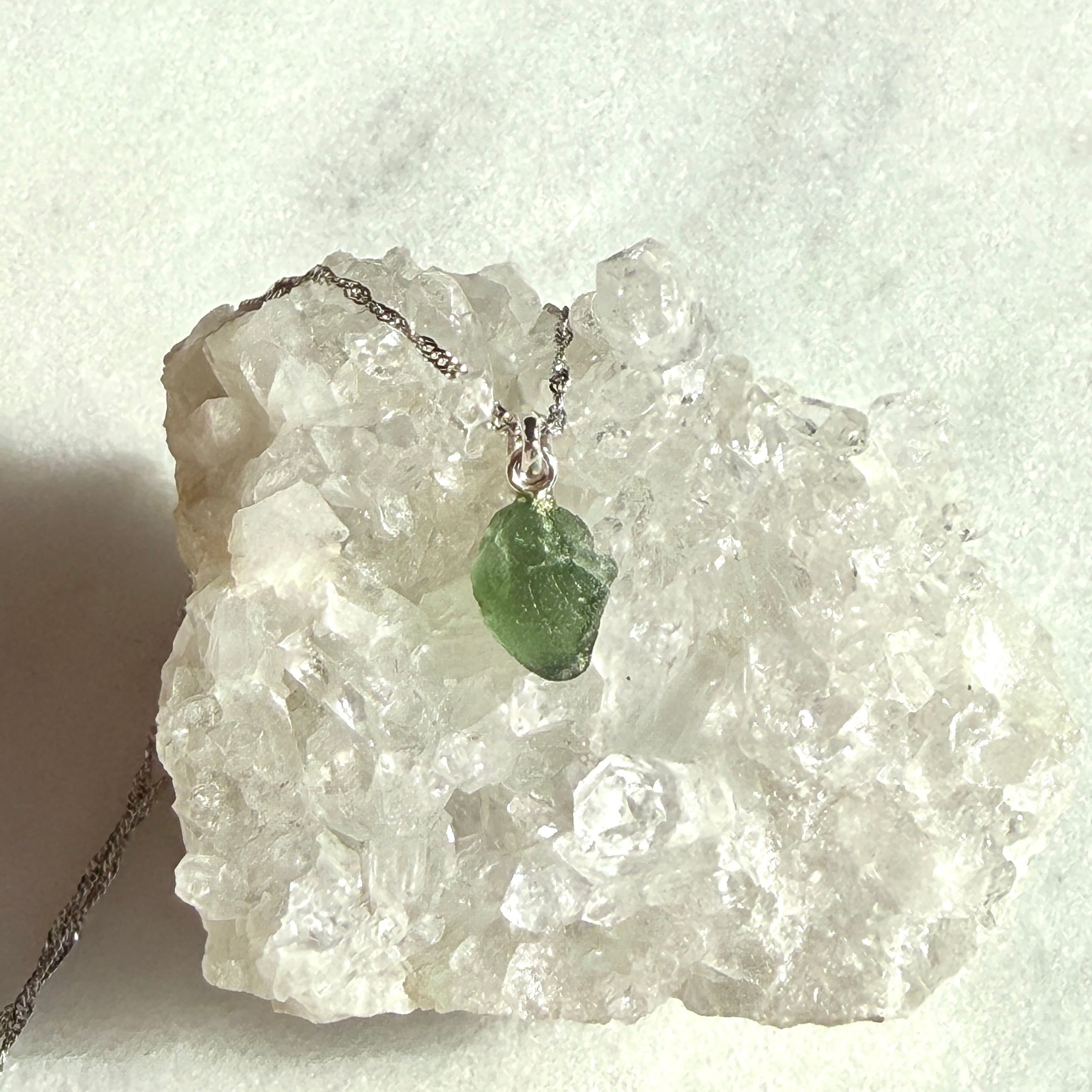 モルダバイトは、約1,500万年前に隕石が地球に衝突した際の衝撃で生まれた、奇跡のガラス質天然石。