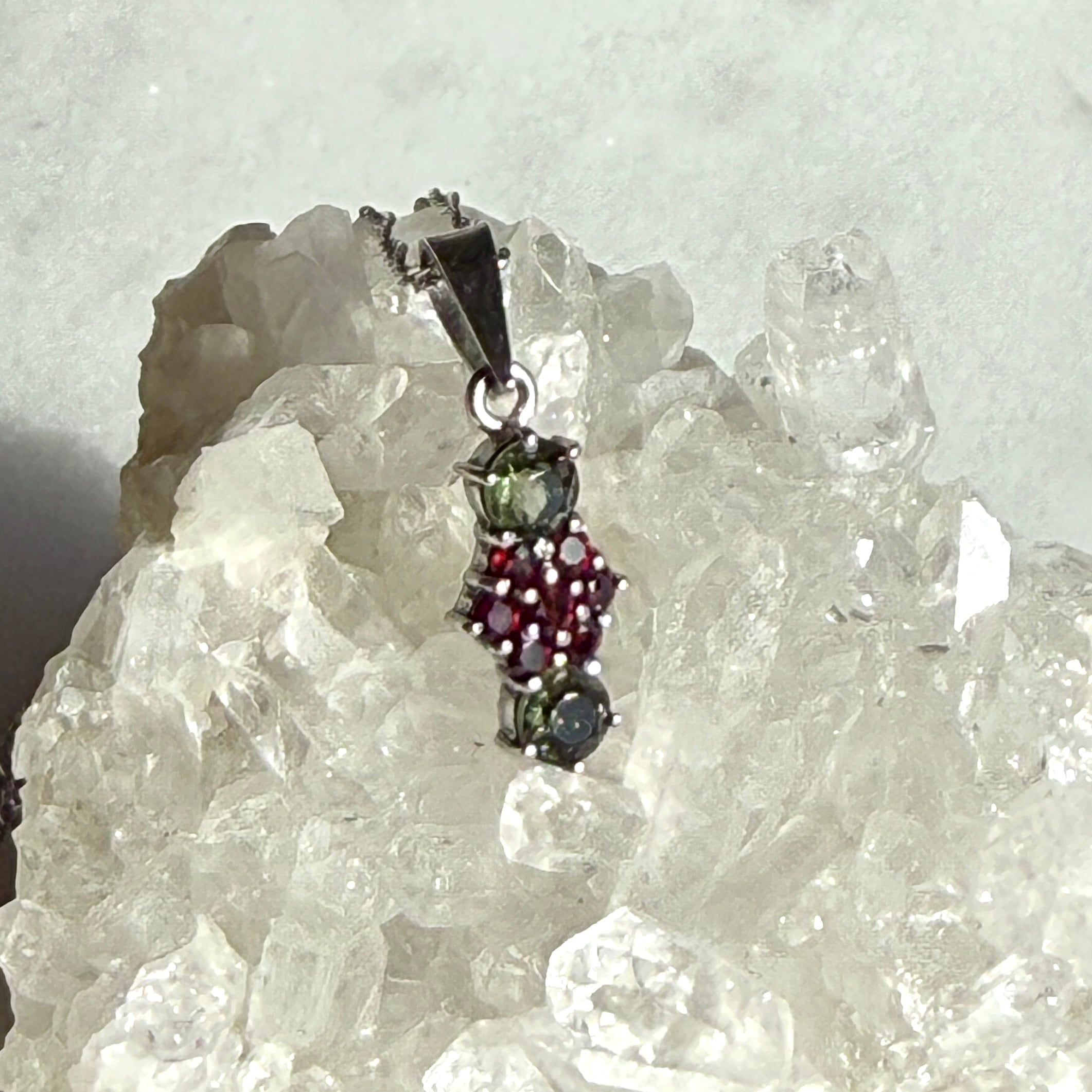 こちらはちょっと贅沢なモルダバイト2粒と真ん中にガーネットのお花です。