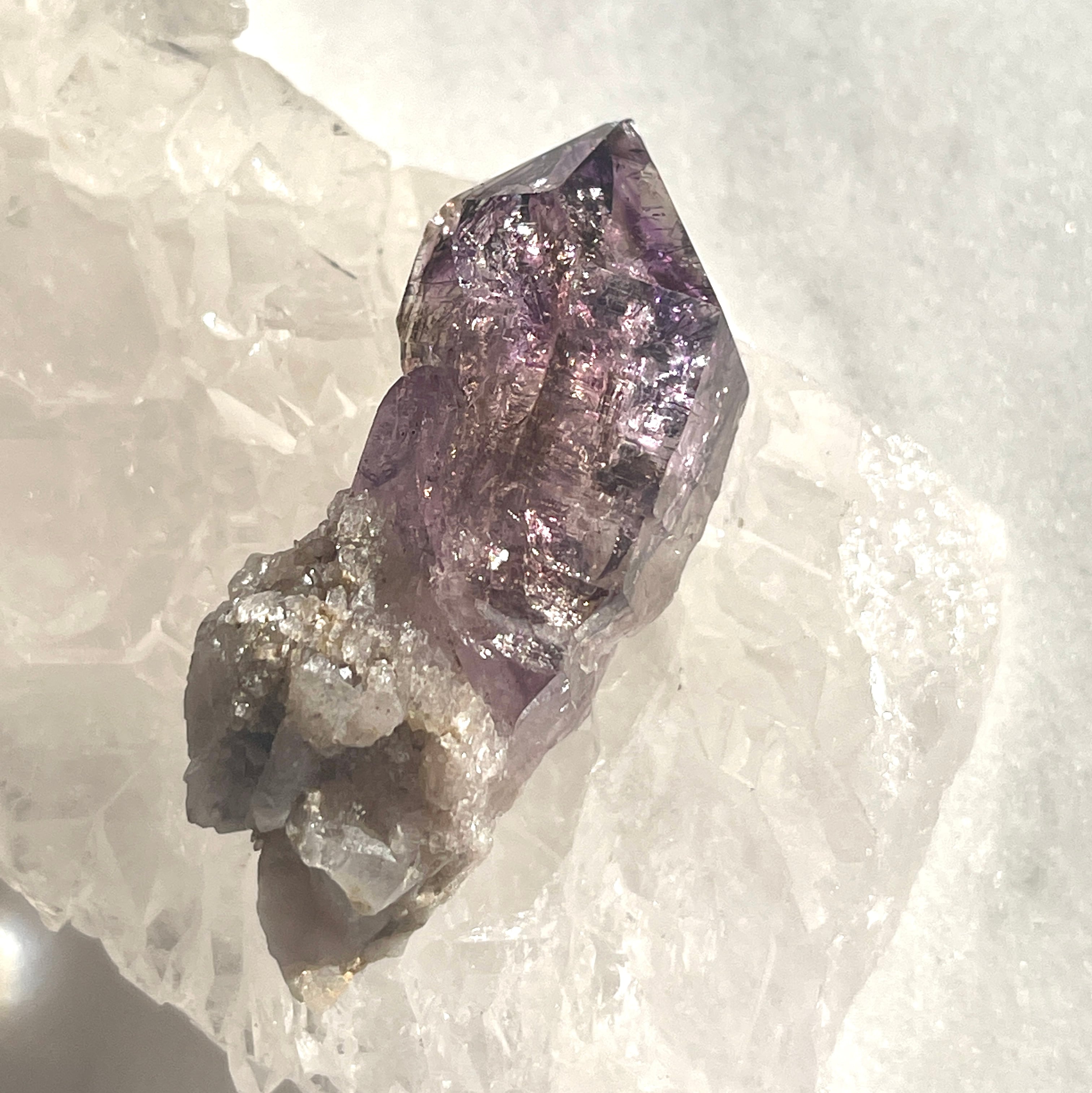 こちらの子は光を当てるとキラキラと内側から光り、虹がでます。「セプタークォーツ」の様相をしており、力強いエネルギーを感じます。紫色が特に美しく、第三の目を刺激します。