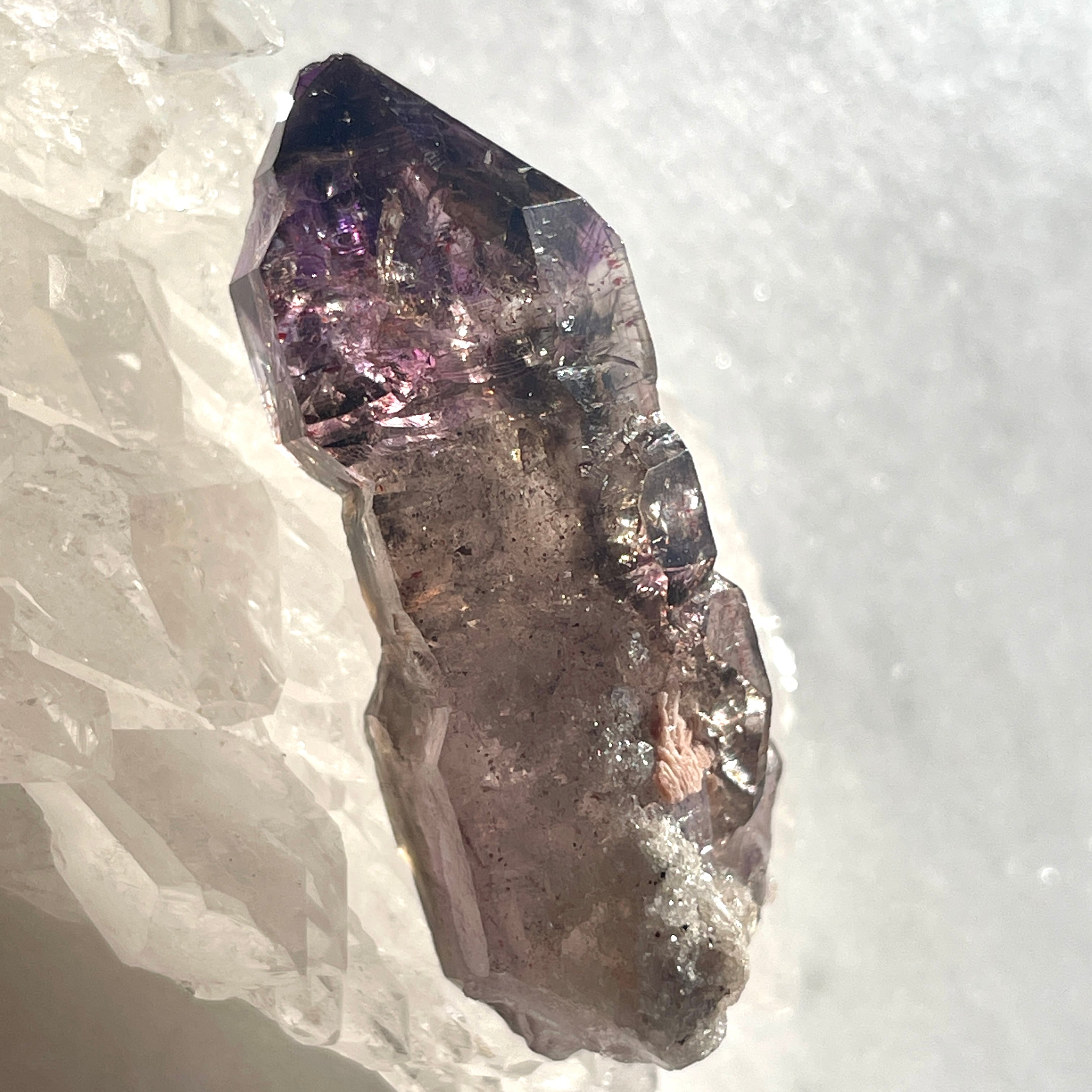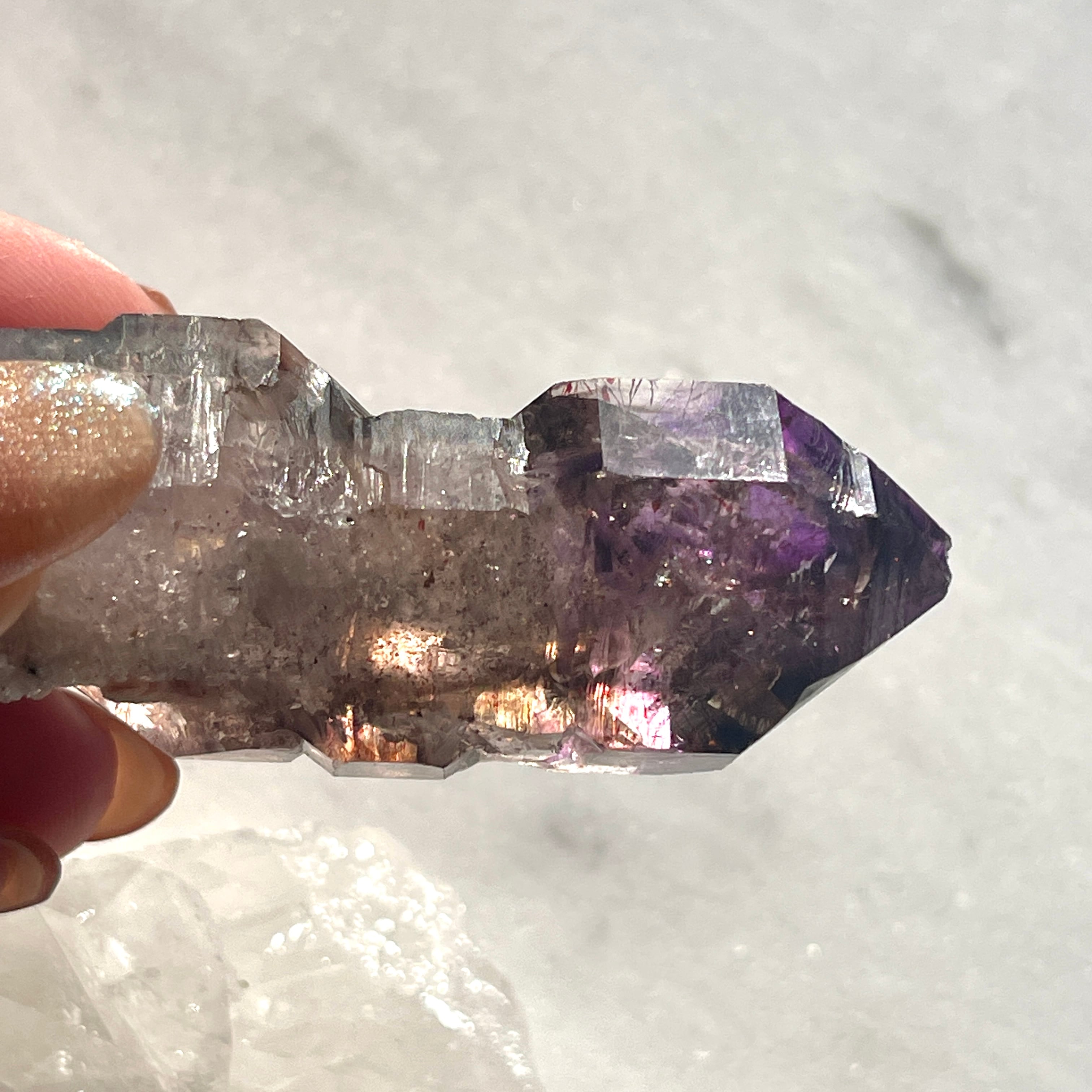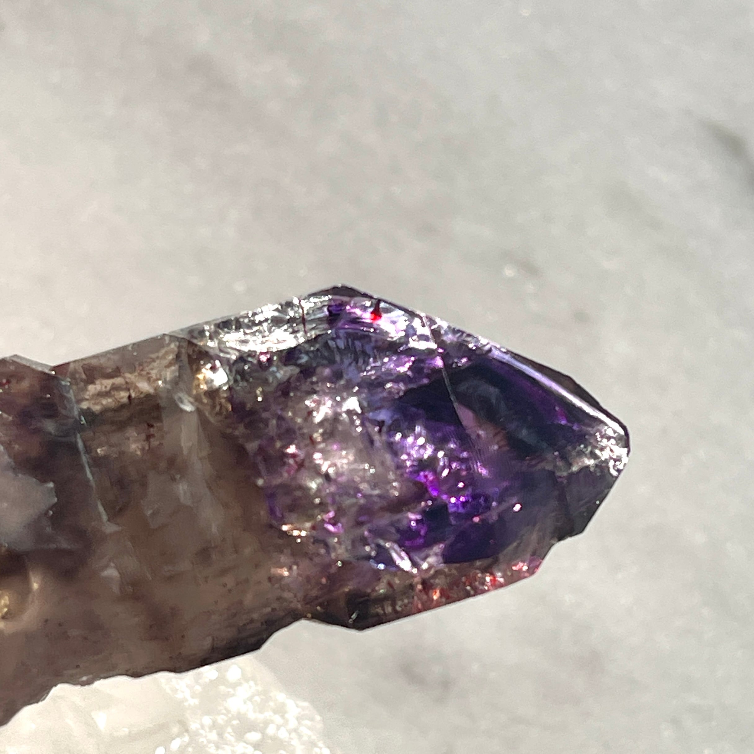 根元には「ブリッジ」とザラメのような水晶の結晶がみられ、そして根元から上に向かうスモーキーな色からの変化、先端の紫色が素晴らしく艶やかです。虹も見えます。