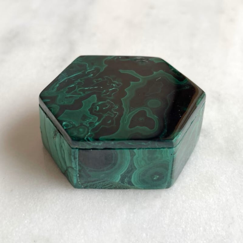 こちらの小物入れは蓋の部分に濃いマラカイトを使っていて、サイドは美しい特徴的な模様をふんだんに使っています。