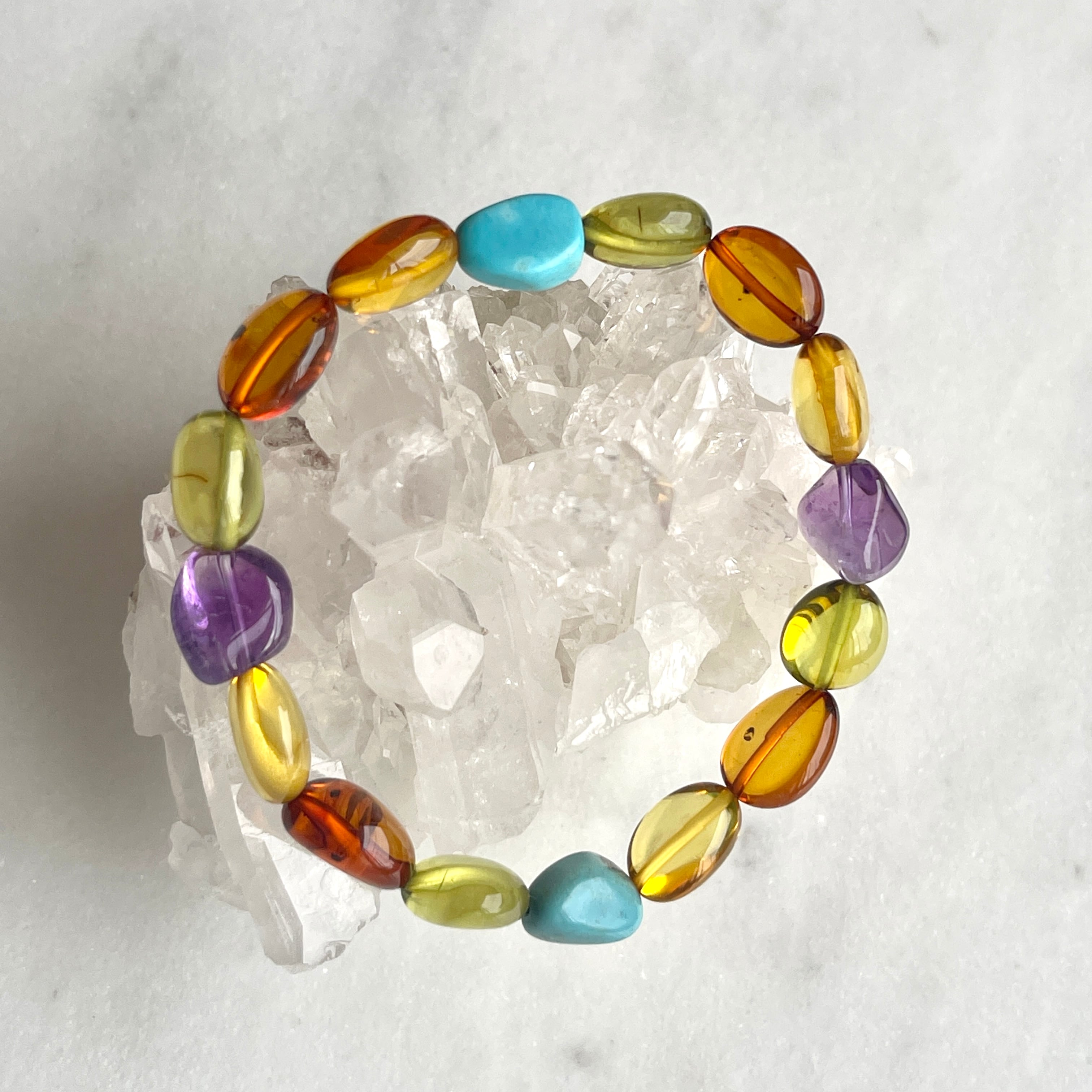 3色のアンバーとアメジスト、ターコイズを組み合わせたブレスレットです。