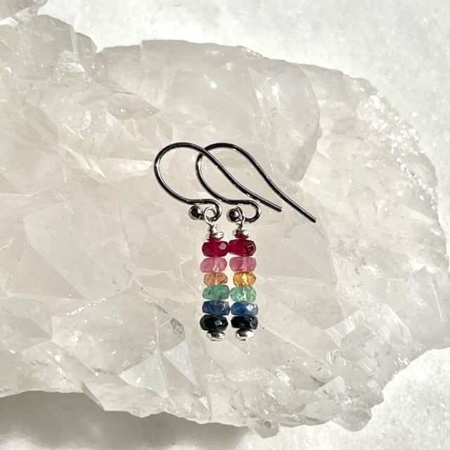 ルビー、サファイア(ピンクサファイア、ブルーサファイア)、プクラジストーン(イエローサファイア)、エメラルドとチャクラカラー盛りだくさんの贅沢なピアス。