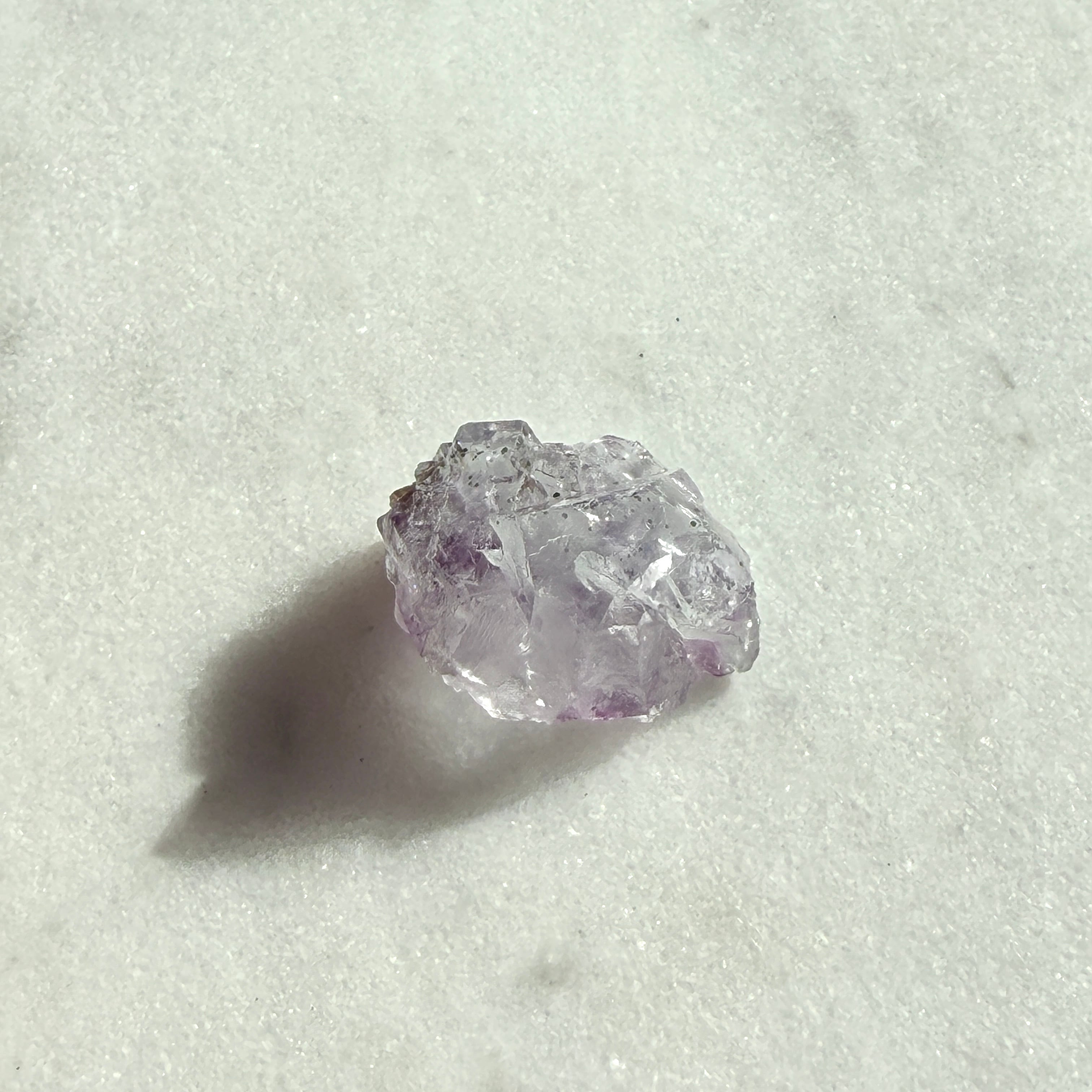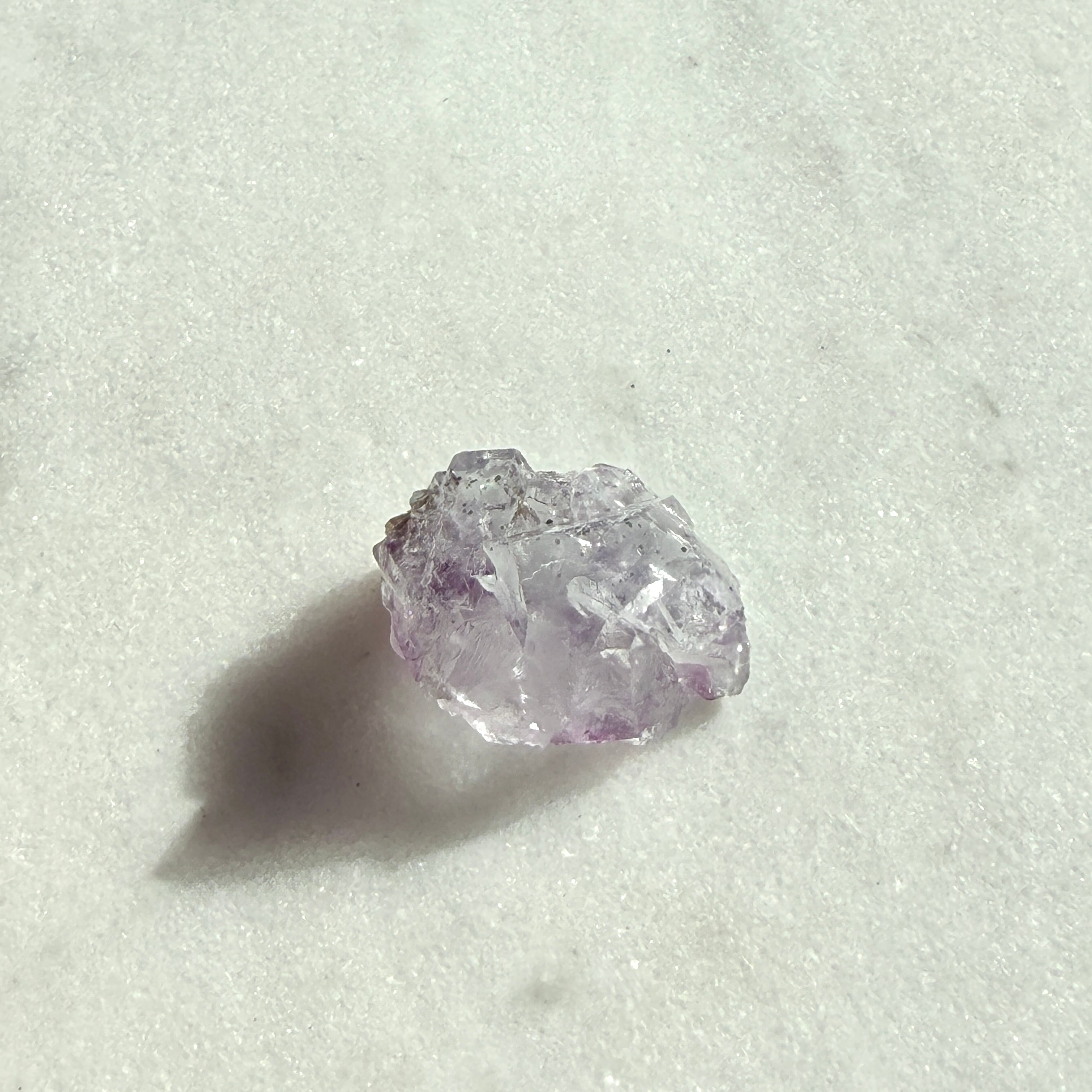 パープルフローライトはその名の通り、紫色の色調が美しく、透明感と発色のバランスが魅力です。瑶崗仙鉱山産のものは、深い紫〜ラベンダー色のグラデーションが現れることが多く、一つひとつの結晶が個性的な色の表情を見せるのが特徴です。
