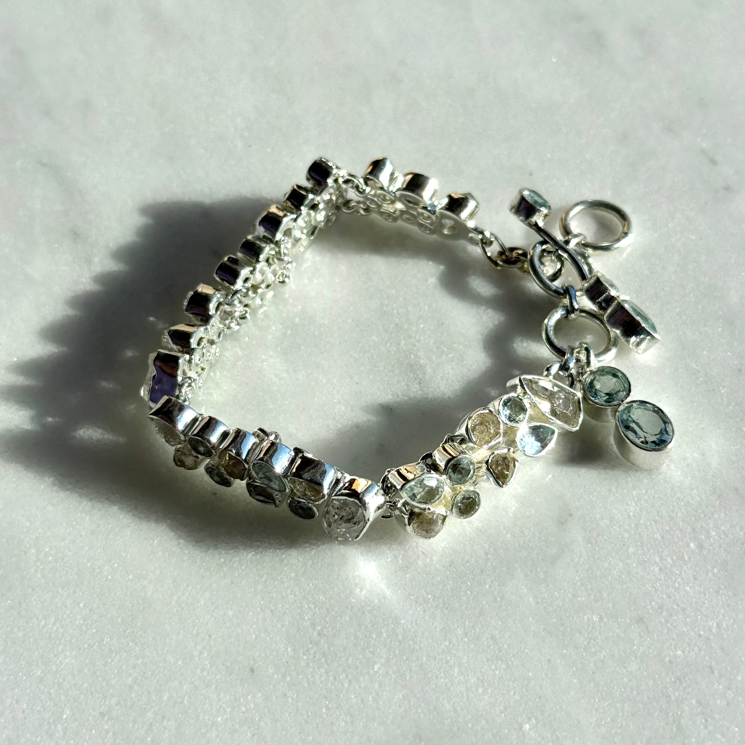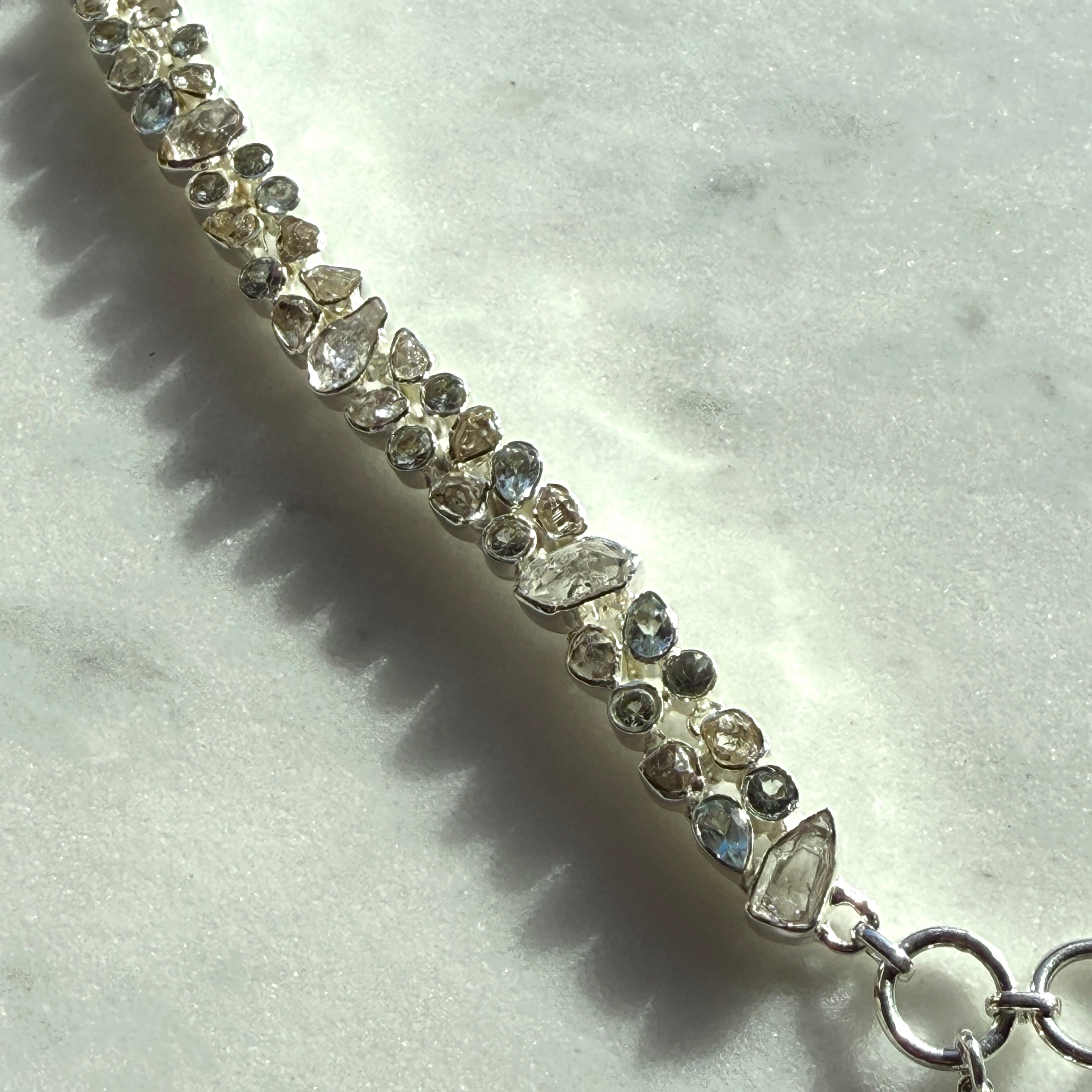透明感あふれるハーキマーダイヤモンドと、深く澄んだブルーが美しいブルートパーズをふんだんに使用し、ひと目で華やかさと気品を感じさせるゴージャスな仕立てに仕上げました。光を受けるたびに繊細なきらめきが生まれ、手元に上質な存在感をもたらしてくれます。