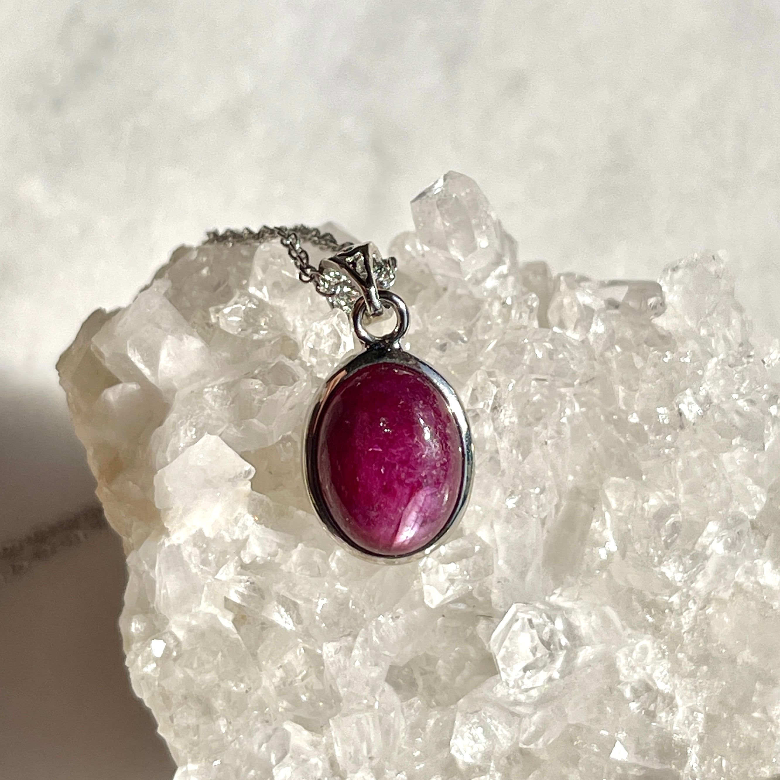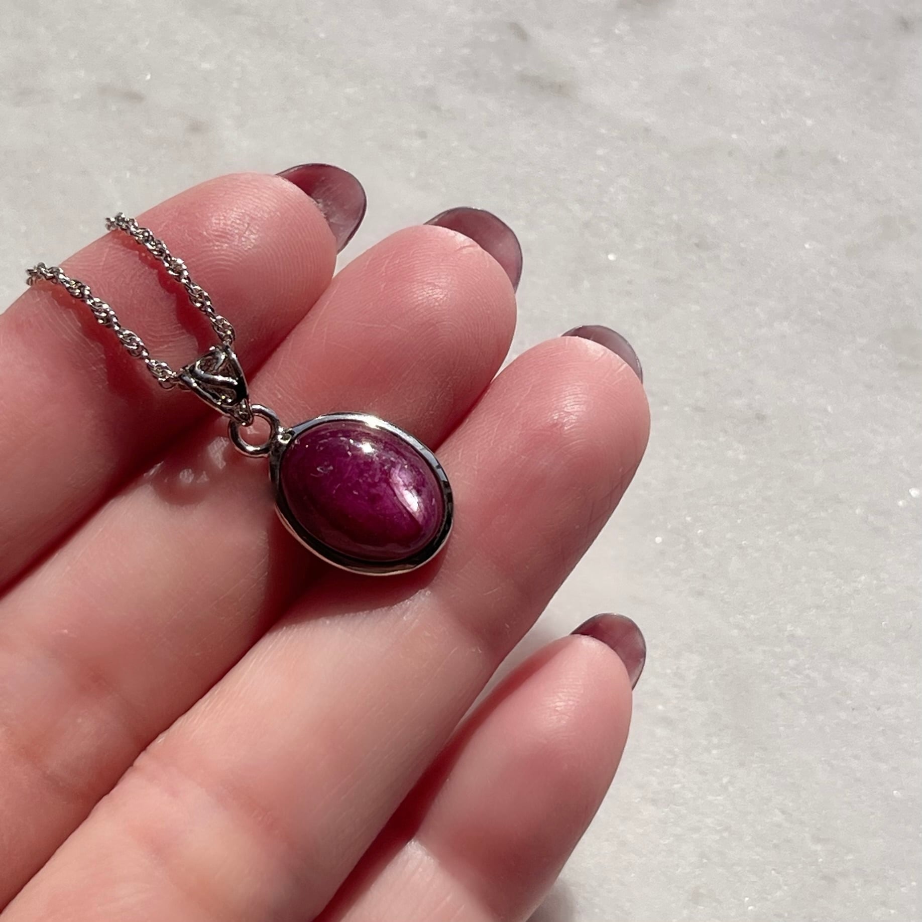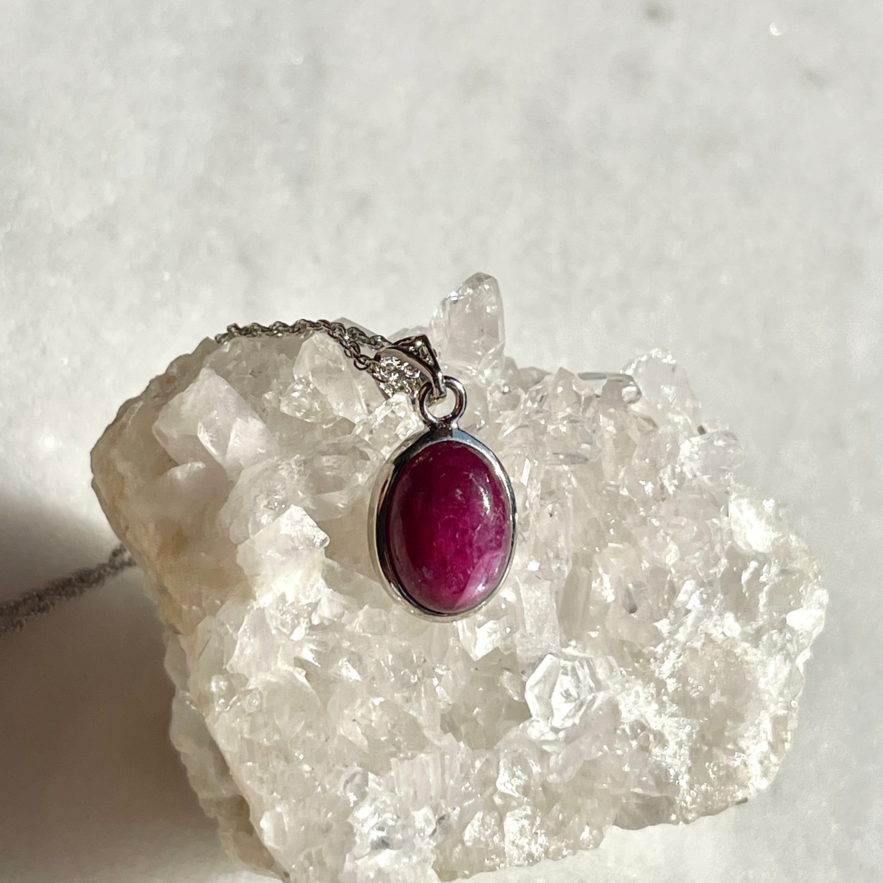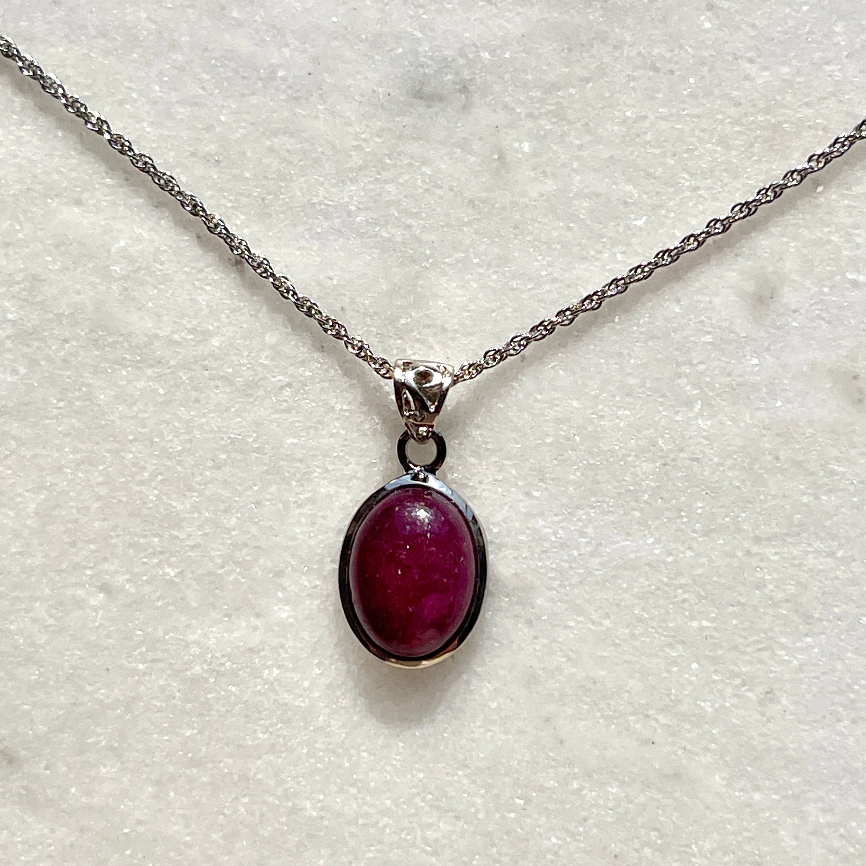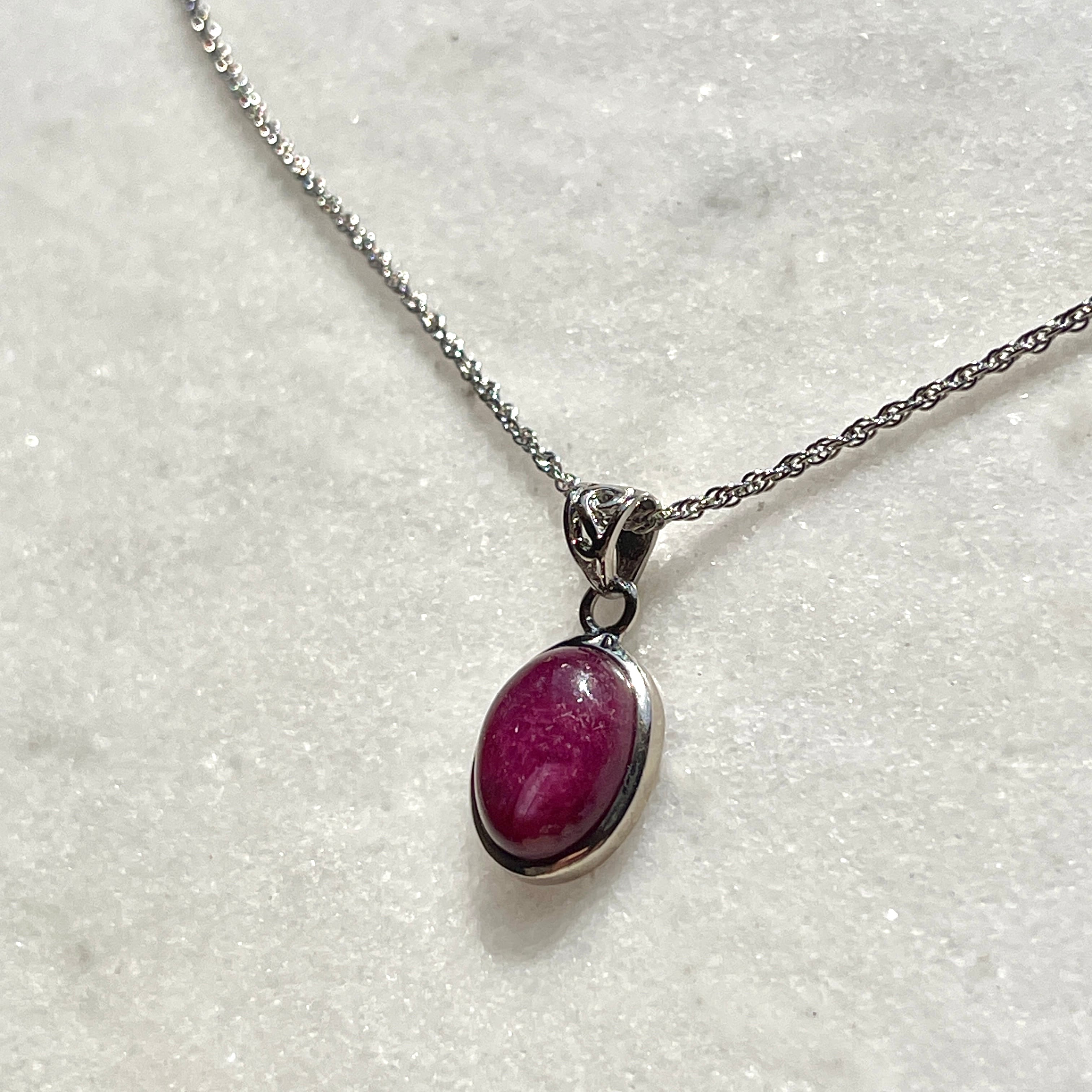 こっくりとした深紅の色がルビーらしいペンダントです。こういうお色は非加熱ならではですね。