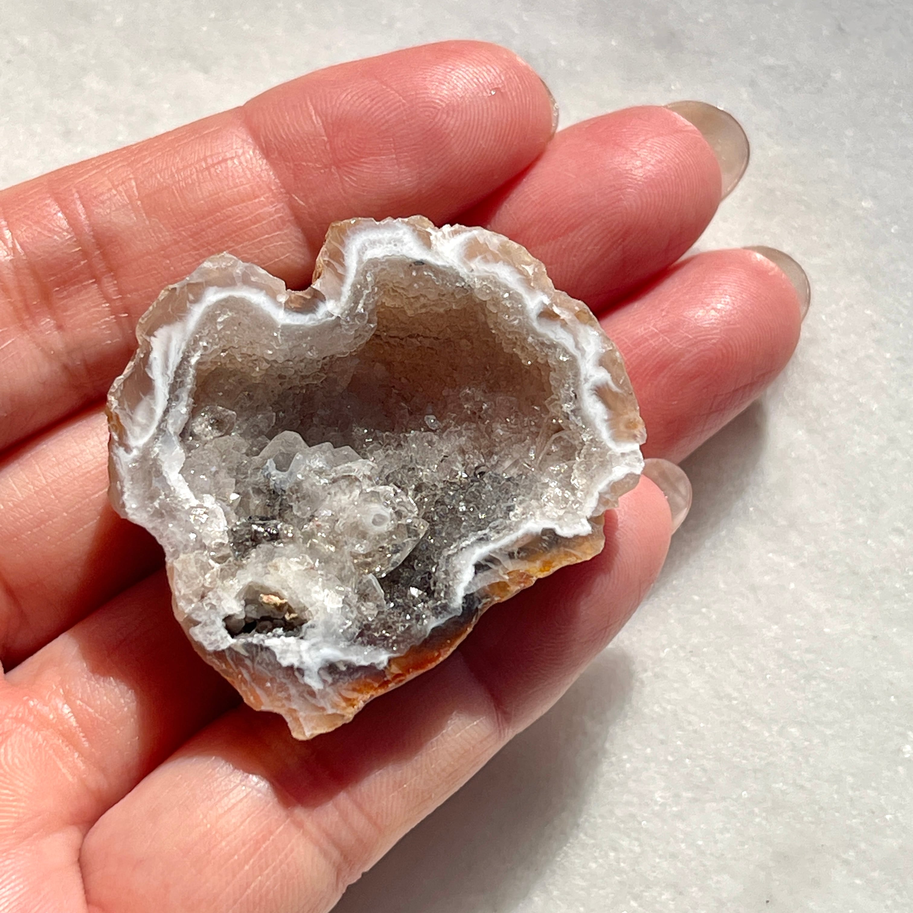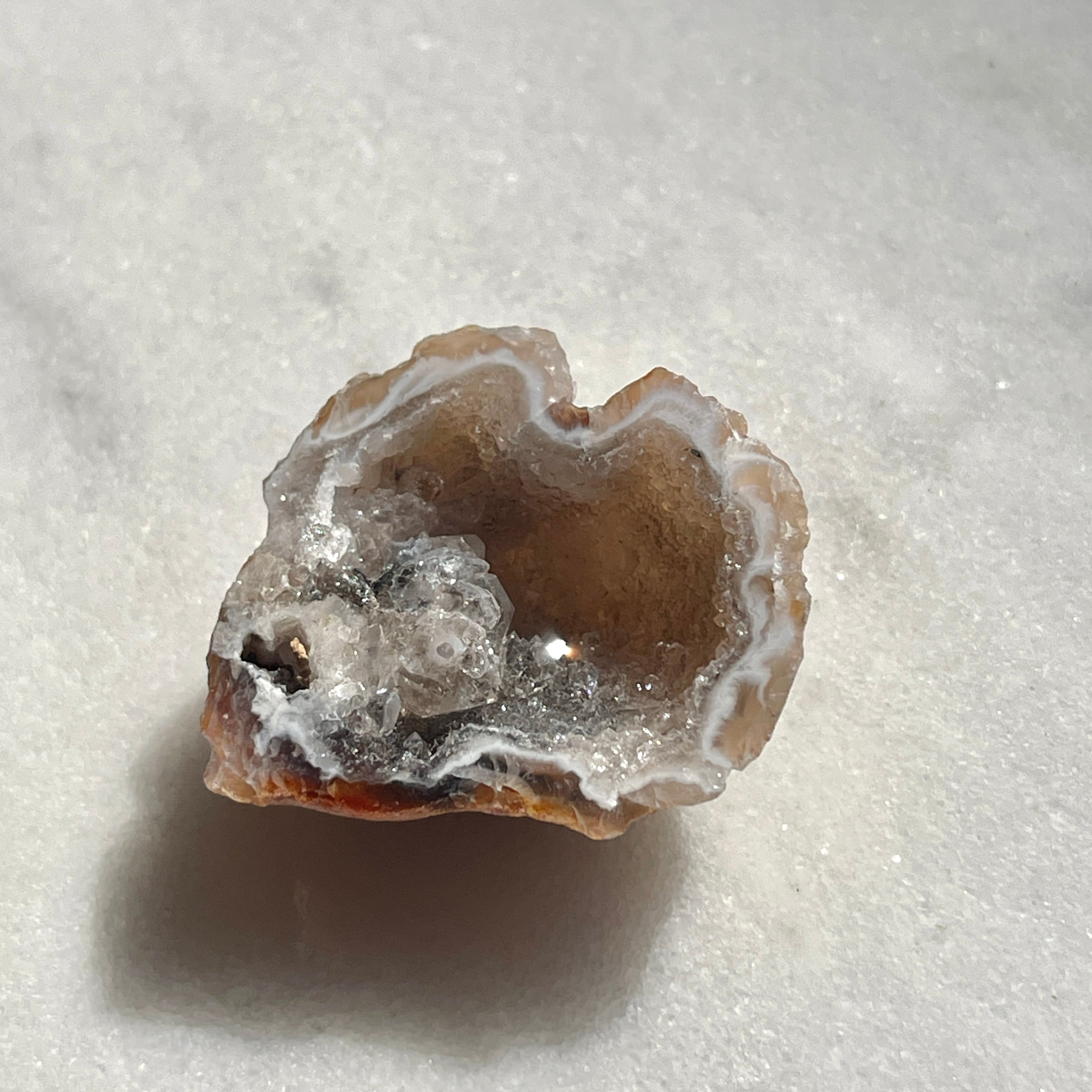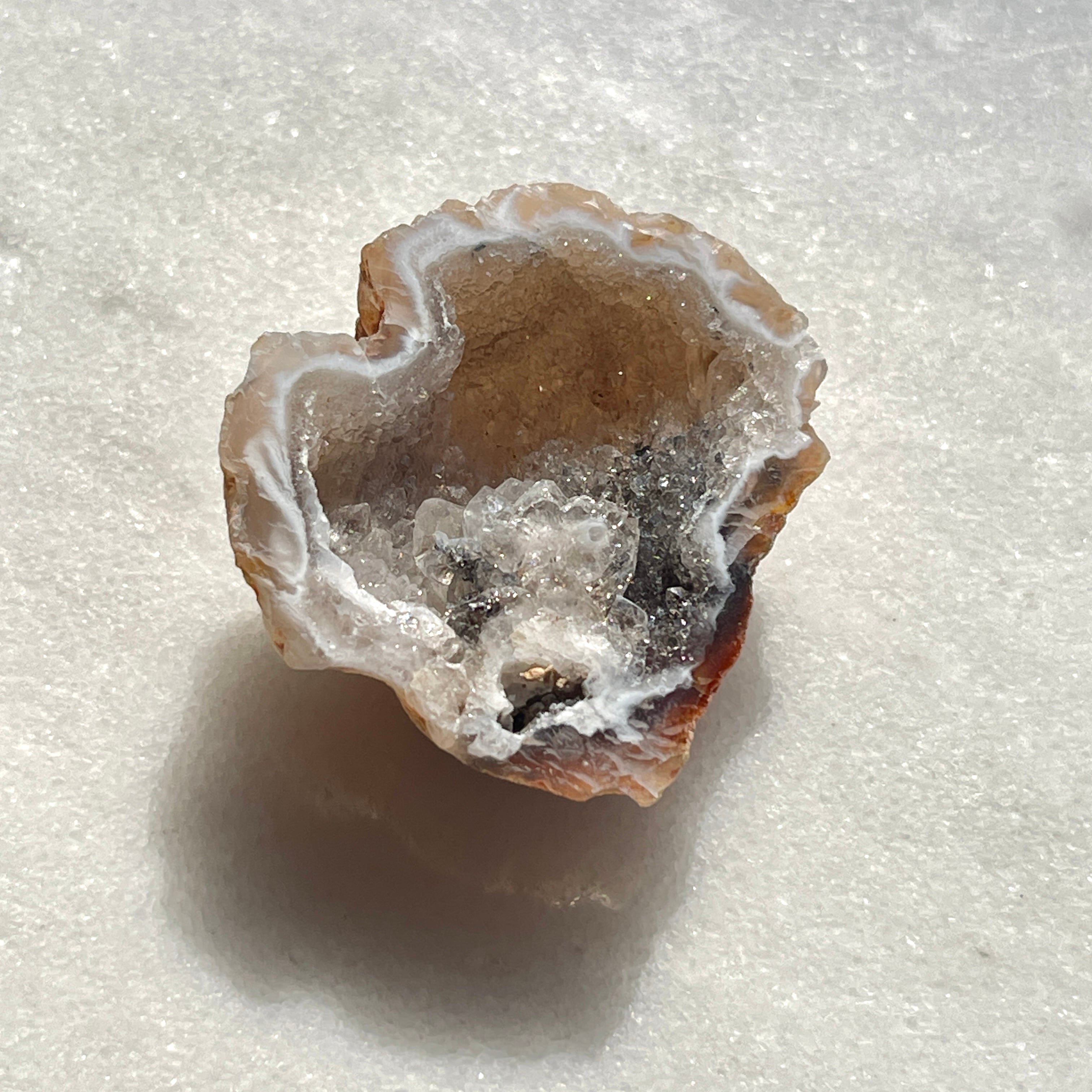 「トレジャー」とは英語で「宝物」を意味し、瑪瑙という石を割ると中から美しい結晶が出てくる石を「トレジャー瑪瑙(めのう)」あるいは「ドゥルージーアゲート」と呼びます。