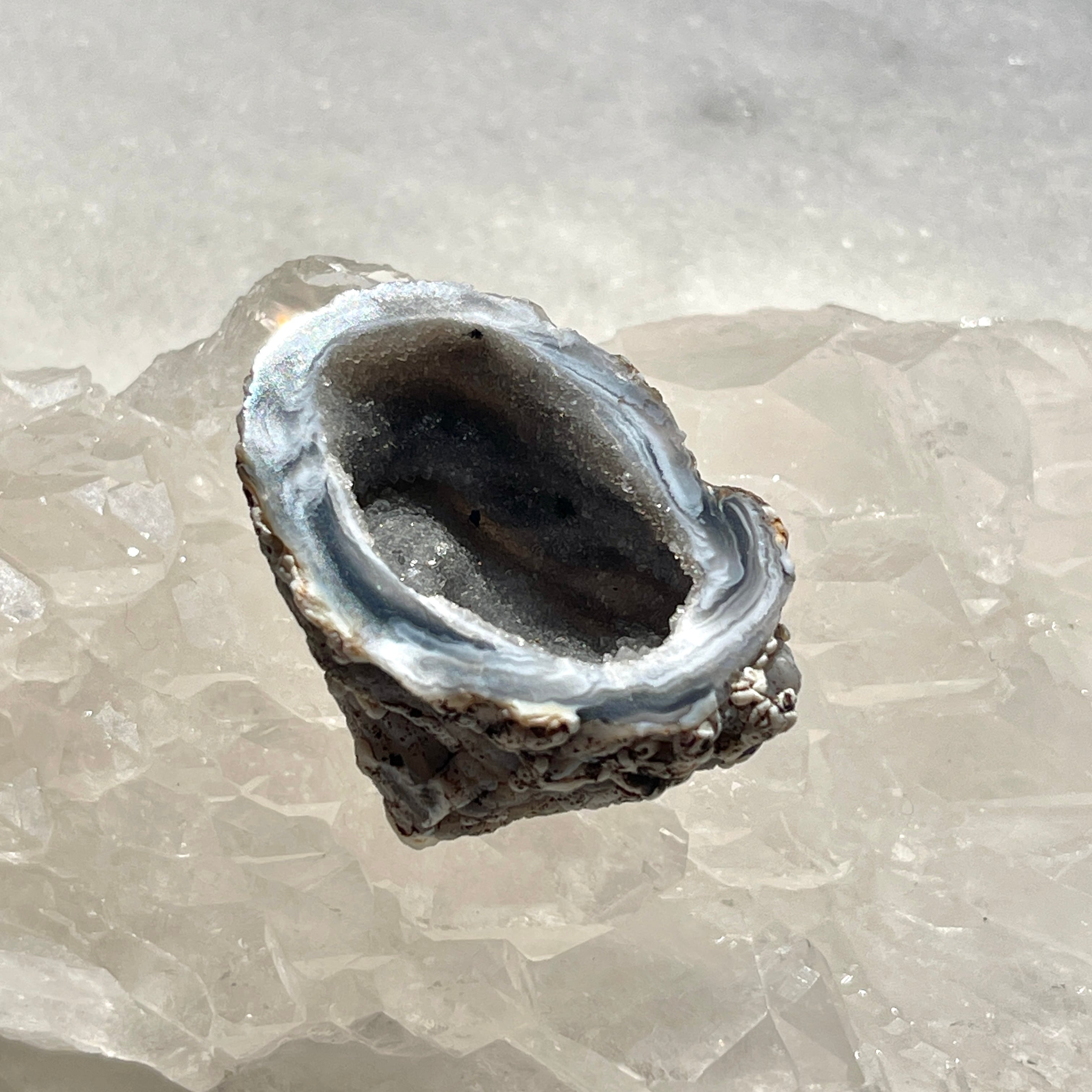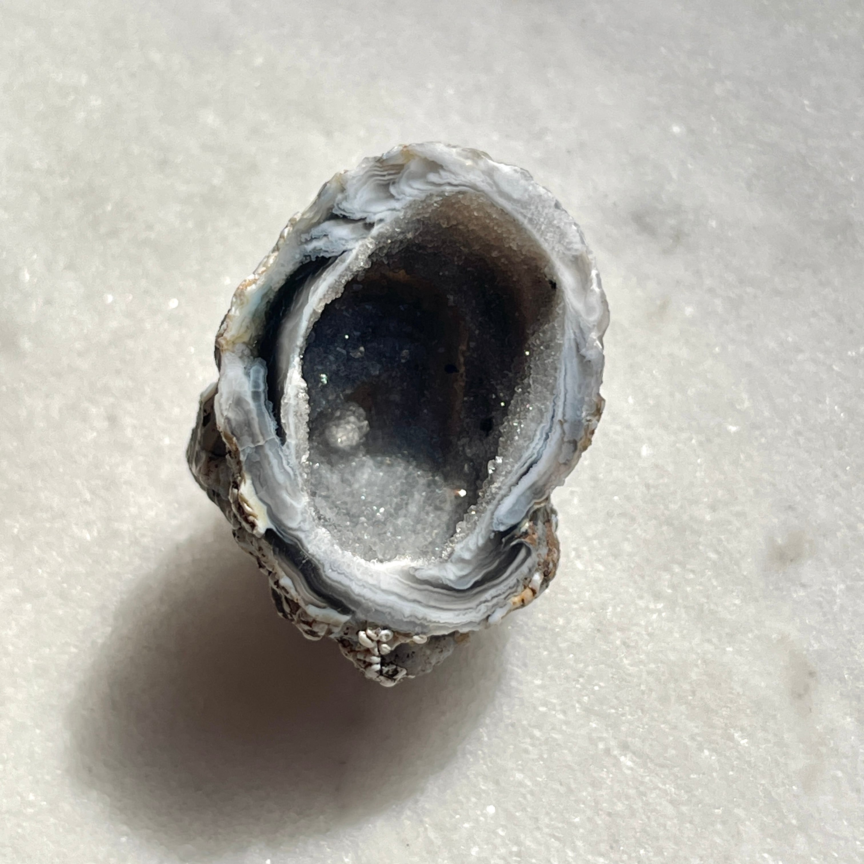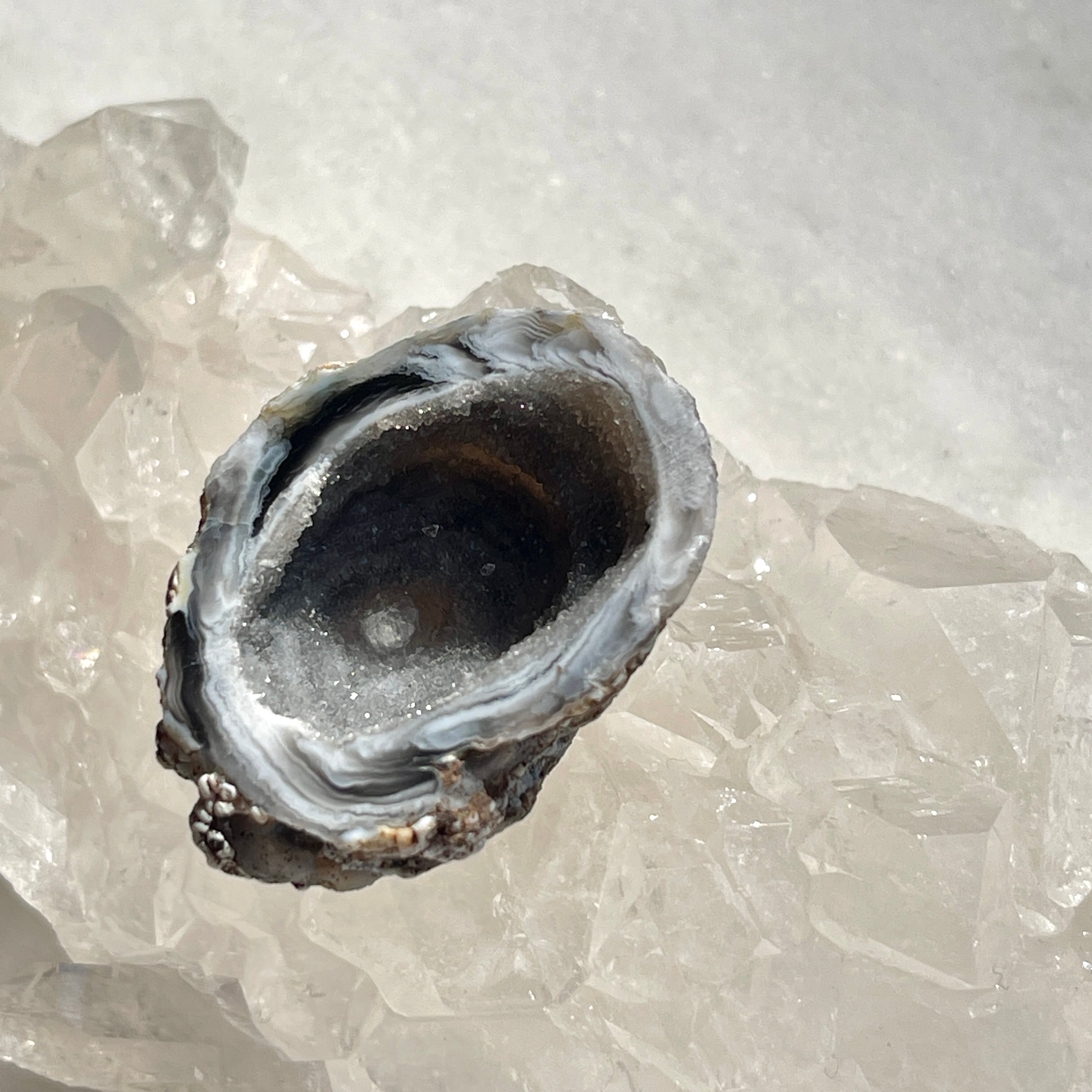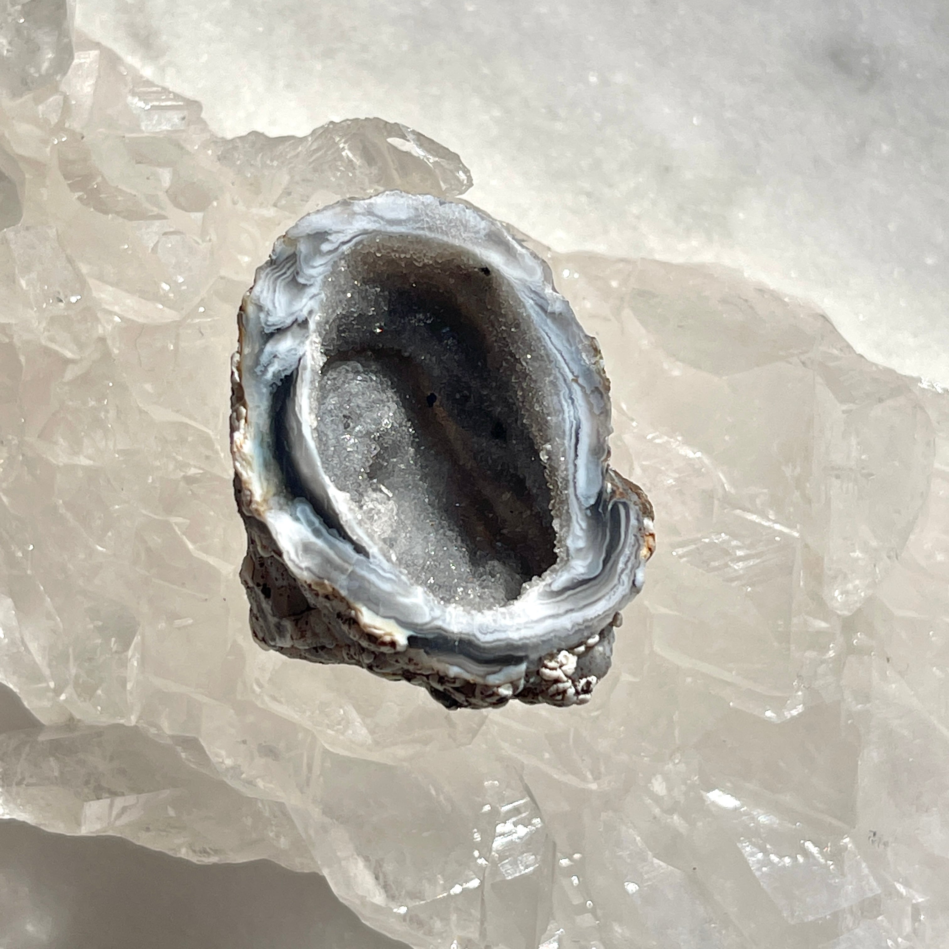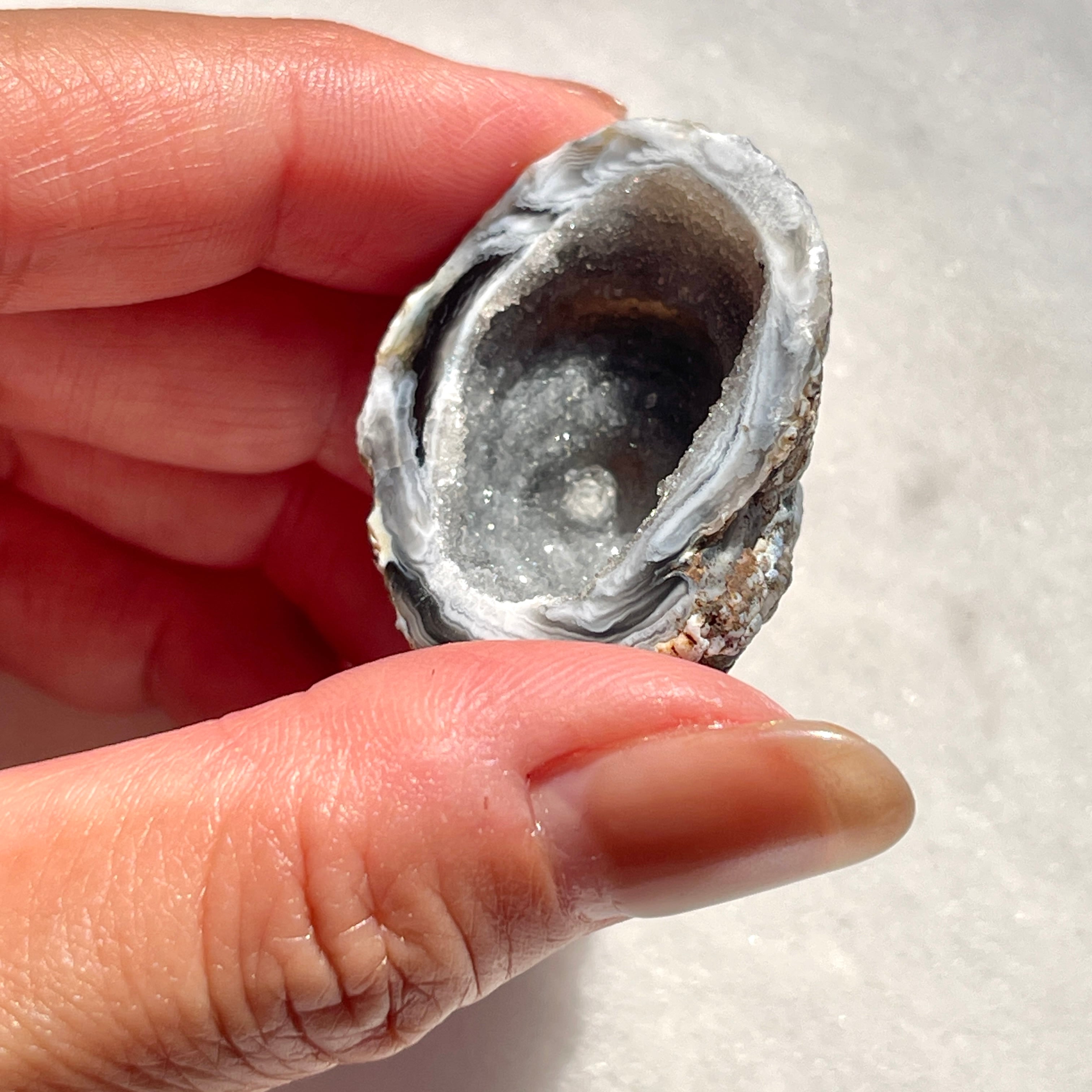 「トレジャー」とは英語で「宝物」を意味し、瑪瑙という石を割ると中から美しい結晶が出てくる石を「トレジャー瑪瑙(めのう)」あるいは「ドゥルージーアゲート」と呼びます。