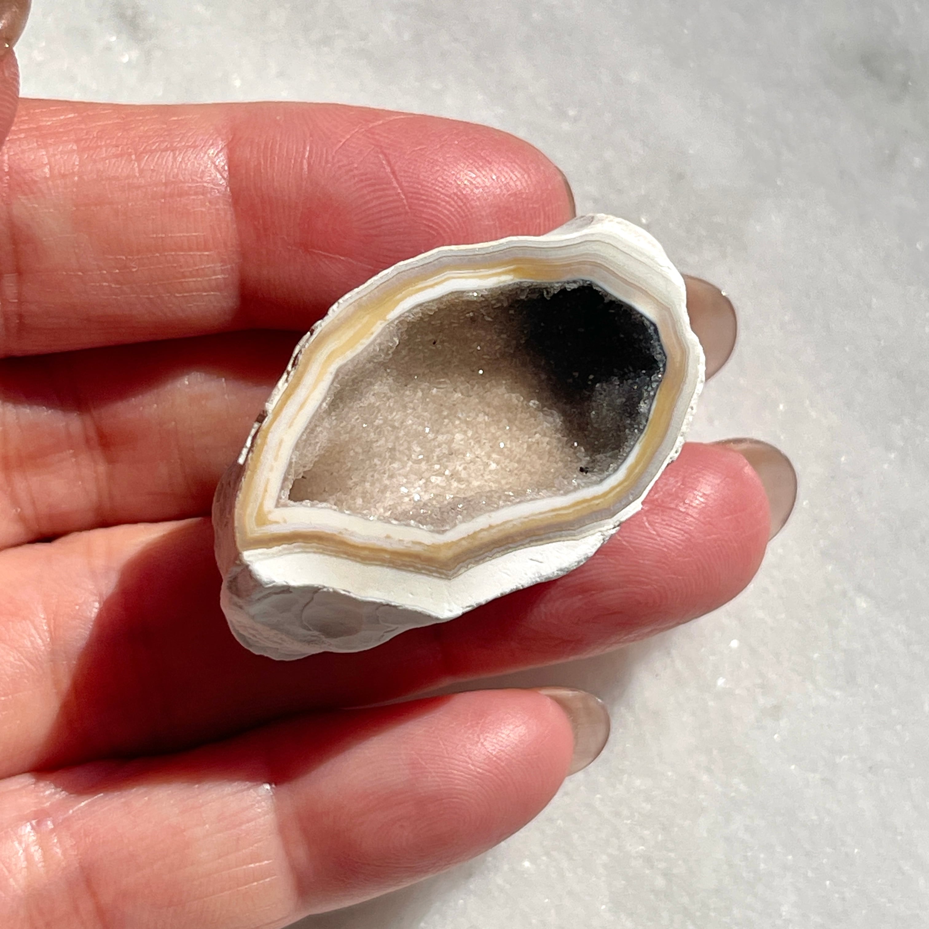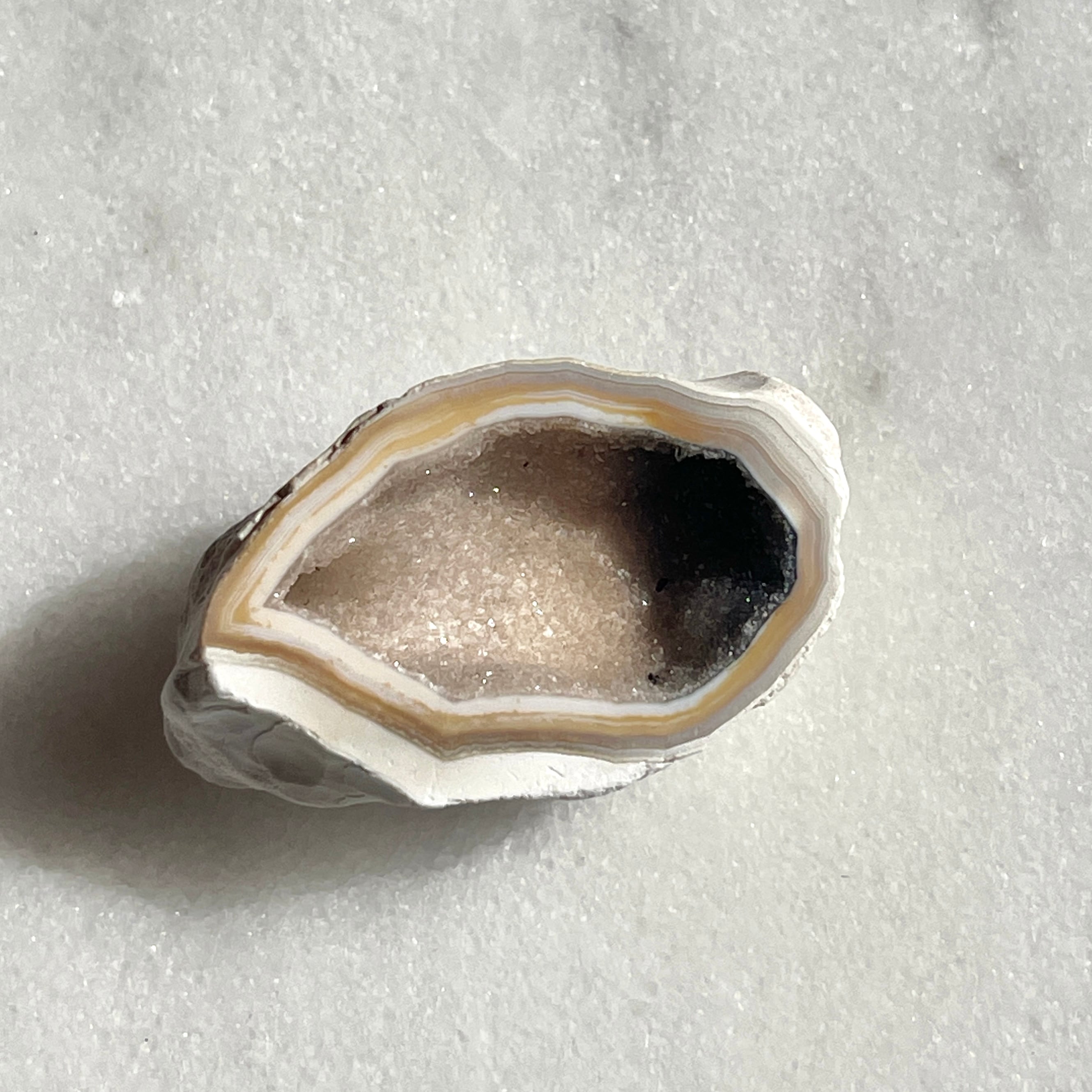 「トレジャー」とは英語で「宝物」を意味し、瑪瑙という石を割ると中から美しい結晶が出てくる石を「トレジャー瑪瑙(めのう)」あるいは「ドゥルージーアゲート」と呼びます。