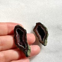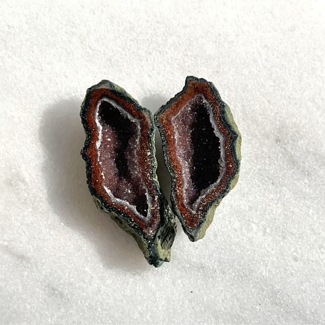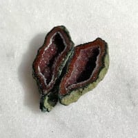 「トレジャー」とは英語で「宝物」を意味し、瑪瑙という石を割ると中から美しい結晶が出てくる石を「トレジャー瑪瑙(めのう)」と呼びます。