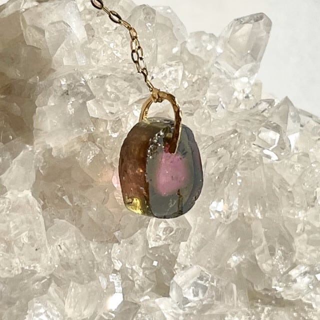 ウォーターメロントルマリンとは緑とピンクが混在しているトルマリンをいい、それがスイカ(英語でウォーターメロン)のように見えることから名づけられました。