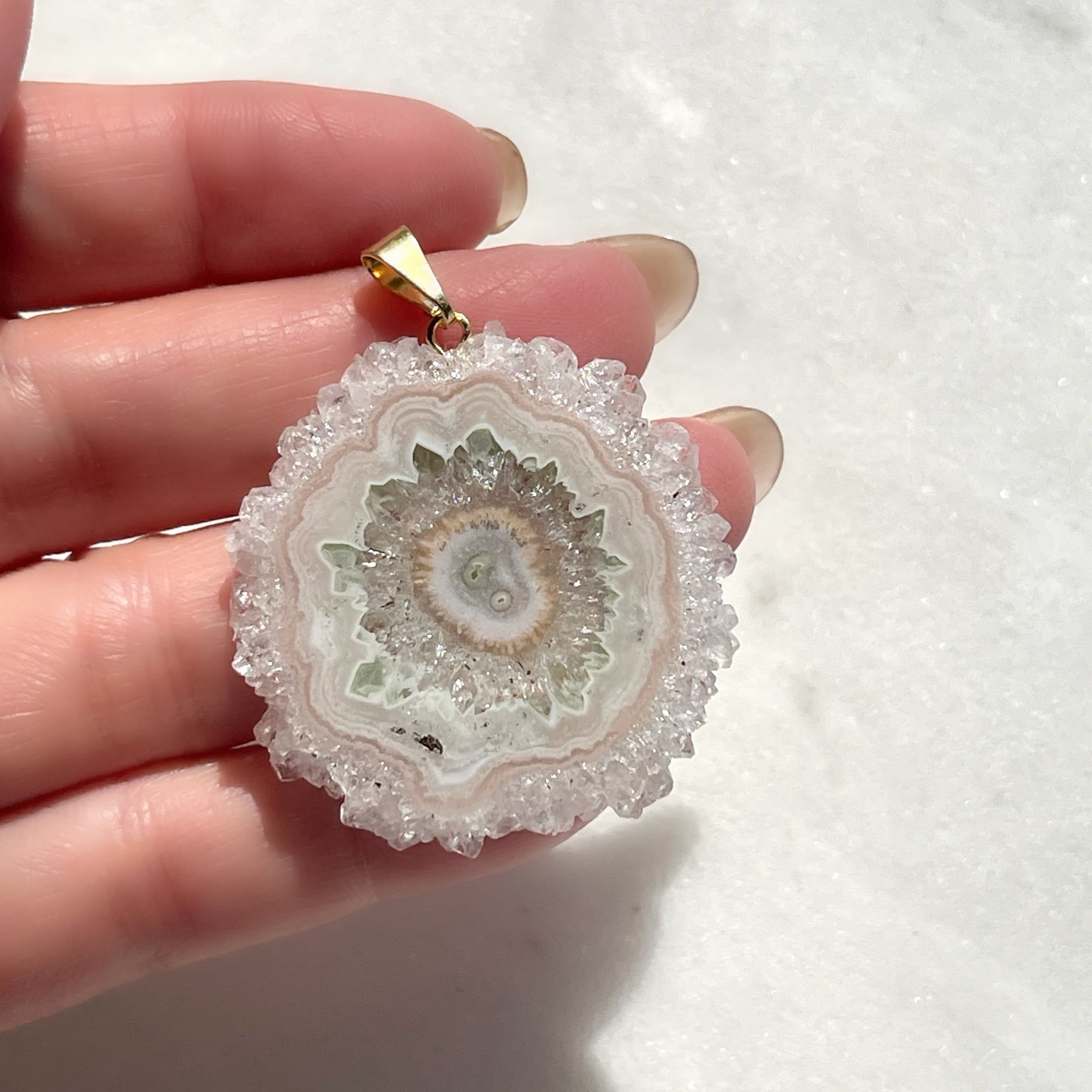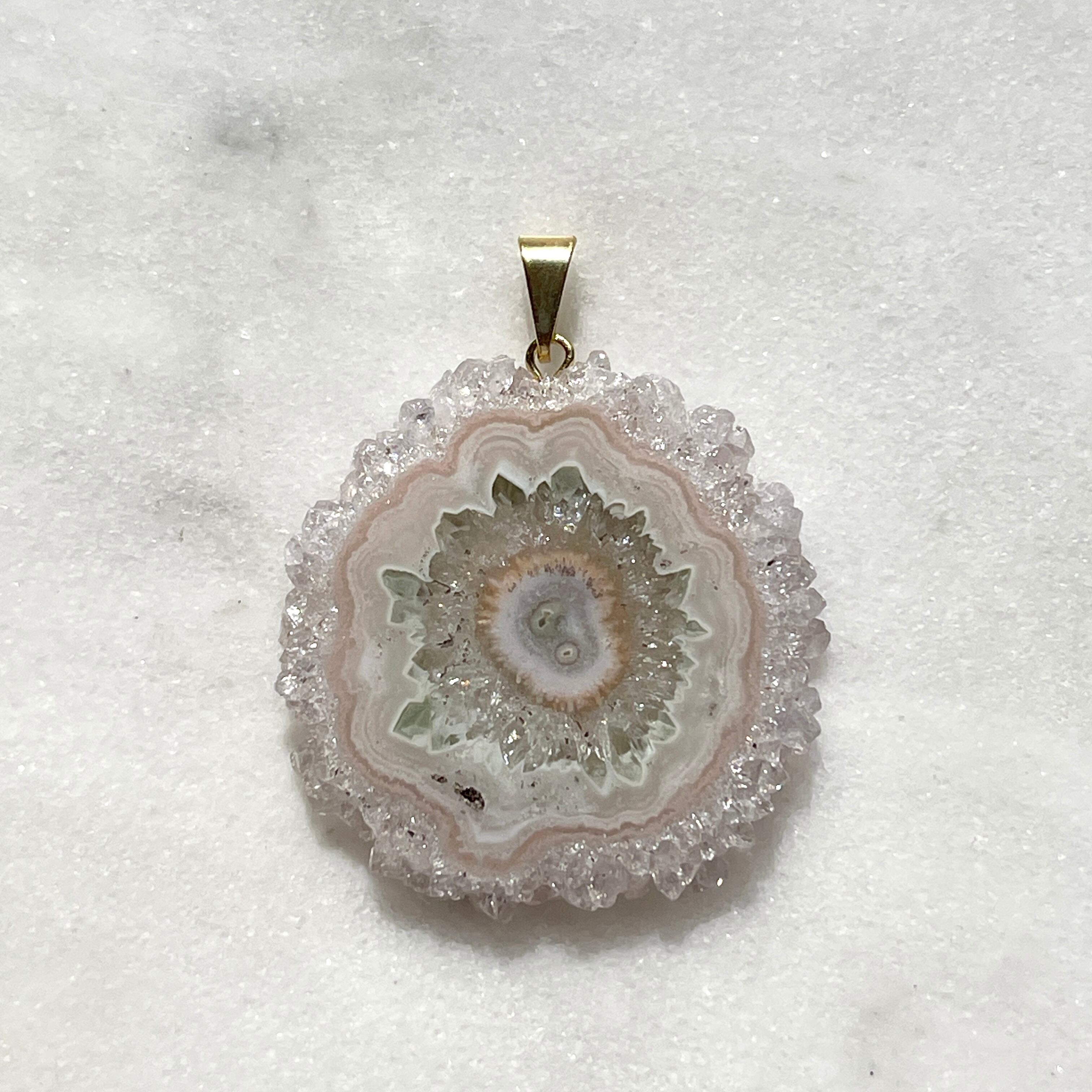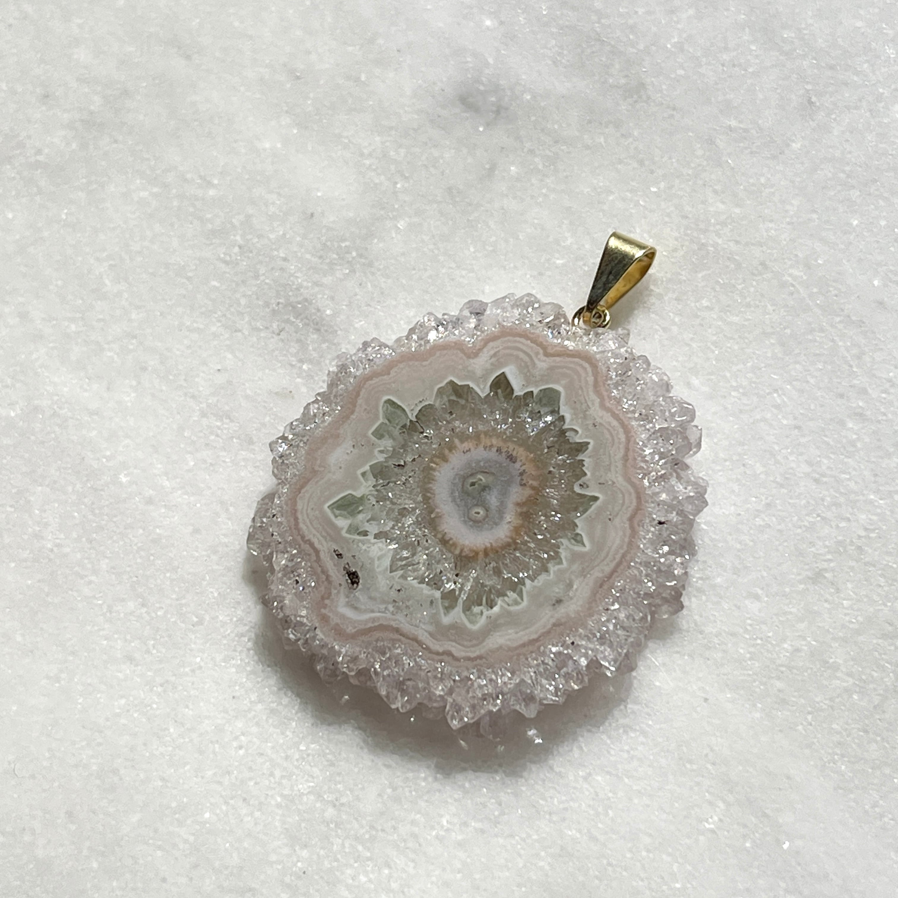 「ソーラー(太陽)アメジスト」といい、ソーラー(太陽)のように中心部のアゲートの周りにアメジストが結晶化したクリスタルです。