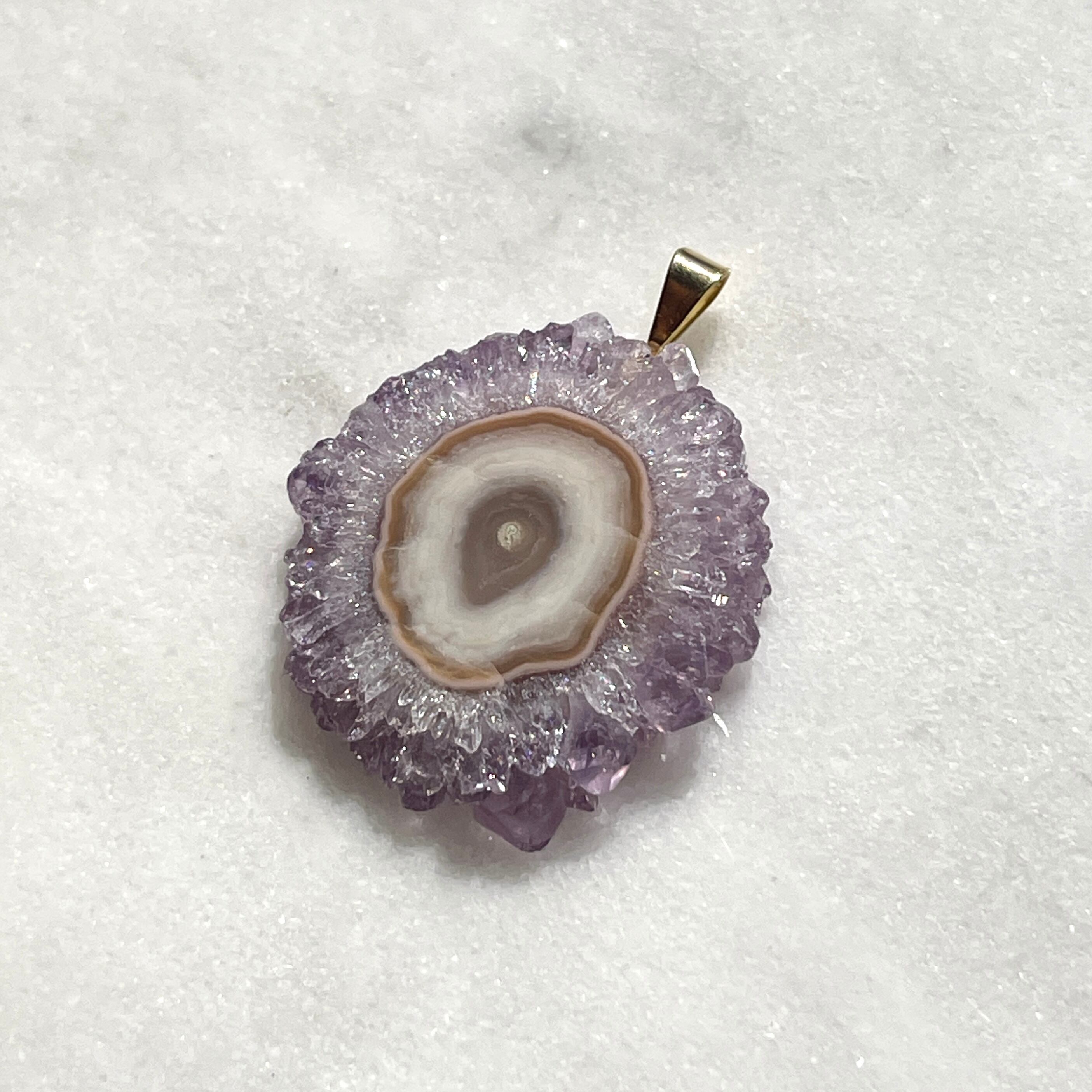 「ソーラー(太陽)アメジスト」といい、ソーラー(太陽)のように中心部のアゲートの周りにアメジストが結晶化したクリスタルです。