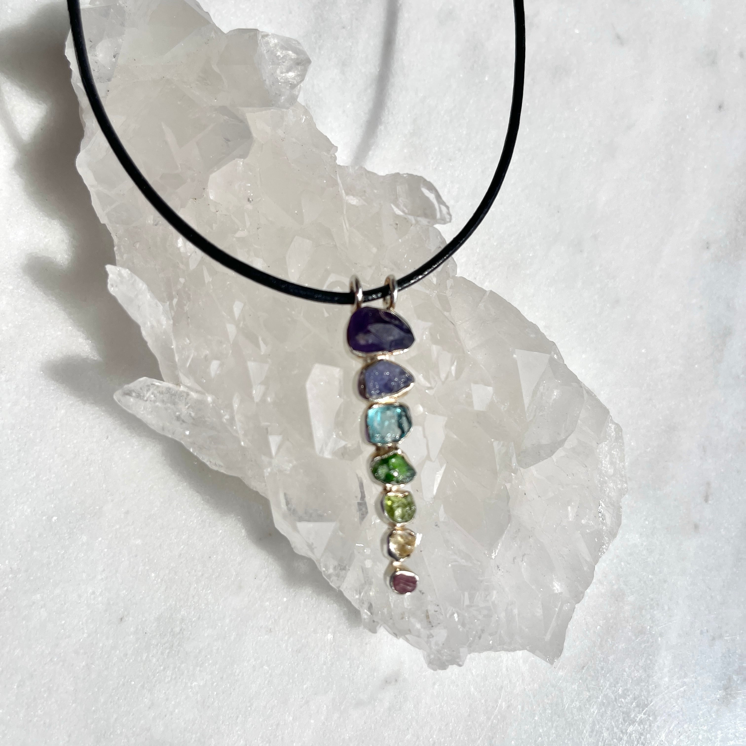 7つの石がはめ込んであり、7色のチャクラカラーで身に着ける人の心身のバランスを調整するペンダント。